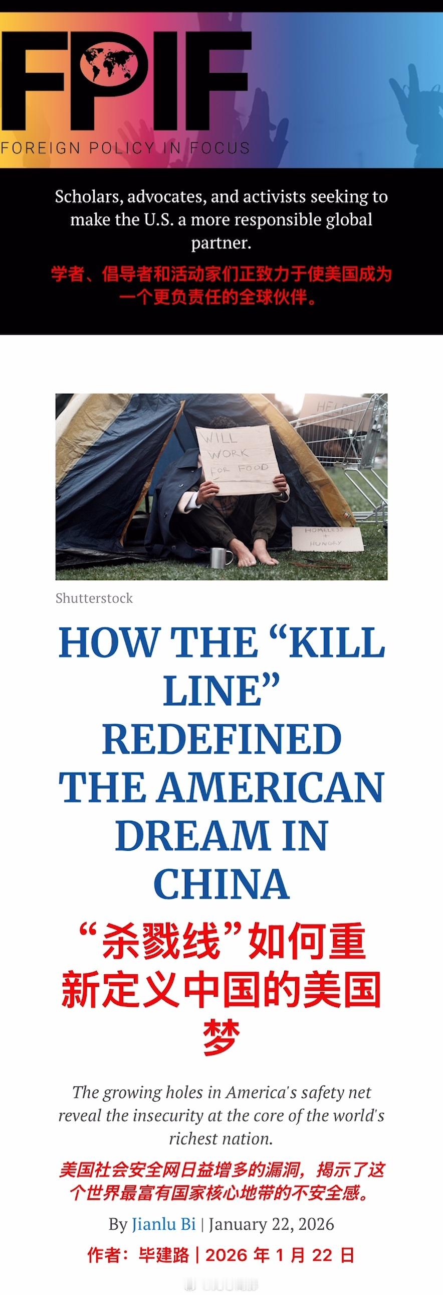 美国智库《外交政策聚焦》(FPIF)文章:“斩杀线”如何重新定义中国的美国梦。副标题:美国社会安全网日益增多的漏洞,揭示了这个世界最富有国家核心地带的不安全感。(全文)最近,一股数字冲击波席卷了哔哩哔哩(Bilibili)和小红书等中国社交媒体平台。引发这场波澜的并非地缘政治摩擦或贸易争端,而是一位西雅图博主发布的爆火视频。视频记录了一位前软件工程师的遭遇,这位曾经的“金领”专业人士在经历了一场突发医疗状况导致失业并被驱逐出住房后,如今只能栖身于帐篷之中。对于数千万中国网民而言,这一刻,“美国斩杀线”正式进入了国民词汇库。这个术语借用自竞技游戏,指的是角色生命值降至某一阈值时,极易受到瞬间且无法防御的终结技攻击。在描述美国生活时,中国观察者用它来形容一种低得令人恐惧的“容错率”。这意味着,一旦遭遇一次厄运——无论是 3000 美元的救护车账单还是突然的裁员——都会触发连锁反应,导致生活彻底崩塌并沦为无家可归者。这种震撼源于一个根本性的认知:在这个世界上最富有的国家,社会的底线并非由木头或石头筑成,而是薄如蝉翼的玻璃。焦虑的算术题:这种幻灭感的主要原因在于“官方”美国叙事与现实生活之间残酷的数学鸿沟。几十年来,美国联邦贫困线(2025 年四口之家设定为 32,150 美元)在远方一直被视为成功的基准。然而,随着信息壁垒的消解,中国网民发现这一数字不过是 20 世纪 60 年代经济学的遗迹。目前的财务分析表明,一旦考虑到现代住房、育儿以及私人医疗保健不可避免的支出,美国主要城市的实际生存门槛已接近四口之家 136,500 美元。对于崇尚将“稳定”和高储蓄作为抵御命运终极盾牌的中国公众来说,意识到近 40%的美国成年人无法支付 400 美元的紧急支出,这不仅仅是一个统计数据,而是一个恐怖故事。它揭示了即使是美国的“中产阶级”,也正行走在离“生死线”仅几英寸之遥的钢丝上。“福利悬崖”的残酷性:对中国观察者来说,最难以理解的或许是“福利悬崖”。在中国,社会安全网通常被视为阶梯:随着收入增加,你的贡献也随之增加,但基本保障依然存在。相比之下,美国的制度运作起来往往像是一个陷阱门。在诸如《2025 大而美法案》(One Big Beautiful Bill Act of 2025)等政策下,补充营养援助计划(SNAP,即食品券)的资格和工作要求被收紧,许多家庭发现自己陷入了系统性陷阱。一个年收入 3 万美元的家庭可能符合医疗补助(Medicaid)和食品援助的条件。然而,如果他们努力工作并将收入提高到 7 万美元,往往会失去这些补贴。突然间,他们被推入了一片“无人区”——对于政府援助来说太“富”,但对于支付高昂的私人保险免赔额和市场价房租来说又太穷。在中国人看来,这是对工人阶级的“肉体收割”,社会流动带来的回报反而是脆弱性的增加。大信息平权时代:这种认知的转变是由极高的透明度驱动的。有史以来第一次,“美国梦”正透过普通人的视角,而非好莱坞制片厂的滤镜被重新审视。通过在 TikTok 和微博上的留学生和海外华人,一个“无滤镜”的美国展现在世人面前。中国网民看到的不再是《绝望的主妇》中修剪整齐的中产郊区,而是美国西海岸连绵不断的帐篷城。他们在小红书上见证了“大对账”,美国用户在上面分享着数额堪比房贷账单的医疗单据。相比之下,中国公民享受的医疗体系中,看一次全科医生的费用比一杯咖啡还便宜,而重大医疗支出大部分由基本国家保险计划覆盖。这种“无中间商”的信息流动使普通美国人的苦难变得具象化,将曾经那座“山巅之城”变成了一个关于社会达尔文主义的警示故事。一种新的民族自信:最后,美国形象的衰落恰逢中国民族自信心的激增。中国已经建立起覆盖超过 95%人口的全面社会保障网,告别了盲目模仿的时代。当今的中国普通民众审视美国时,不再将其视为导师,而是看到一个将“市场效率”置于“社会再生产”之上的社会。美国商业情报公司 Morning Consult 在 2025 年进行的一项全球调查反映了这一转变:中国公民对本国的全球好感度首次大幅超过了对美国的好感度。这未必源于反美主义,而是源于对未竟预期的深刻幻灭。对于一个重视集体福祉和规避风险的社会来说,美国那种以牺牲安全网为代价对个人主义的强调,被视为一种致命的弱点。“斩杀线”现象标志着一个浪漫主义时代的终结。美国梦建立在阶层上升通道的承诺之上,但在现代中国观察者看来,这种流动性就像一台地板不断塌陷的跑步机。除非美国能够解决让其公民处于永久焦虑状态的系统性脆弱,否则它在中国的形象将继续因“生死线”的残酷现实而蒙尘——在那条线上,超级大国的梦想与一张无法支付的账单所引发的噩梦迎头相撞。PS:外交政策聚焦(FPIF)是一个位于华盛顿特区的进步派智库项目,其归属于政策研究所(Institute for Policy Studies, IPS),IPS 成立于 1963 年,有着深厚的反战和进步主义传统。该项目成立于 1996 年,最初是一份印刷期刊,现已发展为数字分析平台。它自称为“没有围墙的智库”(Think Tank Without Walls),旨在连接学者、倡导者和活动家。其核心价值观包括致力于和平、正义、环境保护以及经济和社会权利。主要依靠基金会资助(如福特基金会、洛克菲勒兄弟基金会等)、个人捐款以及 IPS 的支持。FPIF 被视为左中翼(Left-Center)立