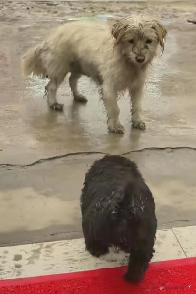 雨天的街头,一只毛色浅淡的流浪狗妈妈,眼神满含恳切地将小黑狗送到一户人家门口。