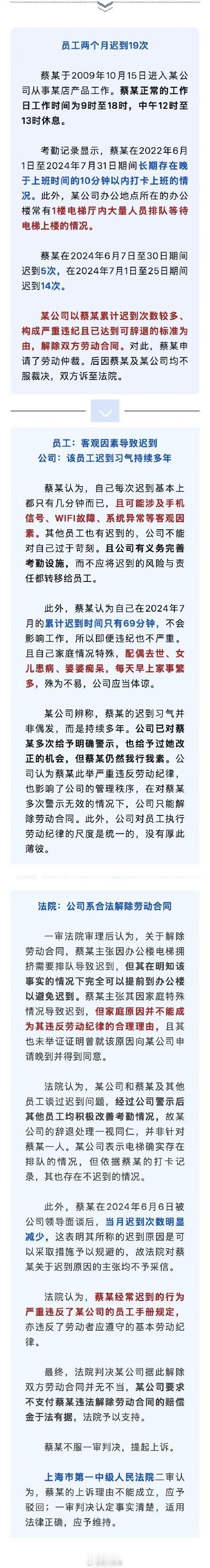女子两个月迟到19次 被开除后起诉公司,15载工龄,栽在19次迟到里 上海写字楼的早高峰电梯,困住了蔡某15年的职场生涯。2024年夏,这位老员工因两月19次迟到被开除,一纸判决书,击碎了“资历能抵过错”的幻想。 故事的底色满是荒诞。蔡某以电梯拥堵、妻亡女病为托词,试图用家庭悲情掩盖违纪事实。可14次迟到扎堆7月,早有前科的考勤记录,都在揭穿“身不由己”的谎言。 公司的反击冷静且致命。长期警告记录、面谈纪要、员工手册,完整证据链证明:规则早已告知,机会不止一次。约谈后迟到短暂减少,更坐实了“可规避”的结论。 法院的判决,是对职场温情绑架的一记重拳。电梯拥堵是常态而非意外,家庭困境无合规申请加持,情理从来不是突破规则的免罪金牌。 网友的哀嚎更显认知错位。“15年贡献抵不过19次迟到”的感慨,本质是混淆了贡献与底线。职场从不是论功行赏的慈善堂,守纪是契约的基本前提。 更可笑的是“电梯迟到合理则提前下班可允”的歪论。用双重标准绑架规则,既是对守时员工的不公,也是对职场秩序的践踏。 这场闹剧给劳资双方上了一课。企业要守住程序正义,制度刚性需搭配人文通道;员工别迷信资历特权,困境面前沟通比辩解更有用。 15载光阴终敌不过19次侥幸,不是规则太冷酷,而是成年人的世界,从来没有“情理大于法理”的例外。 女子两个月迟到19次 被开除后起诉公司