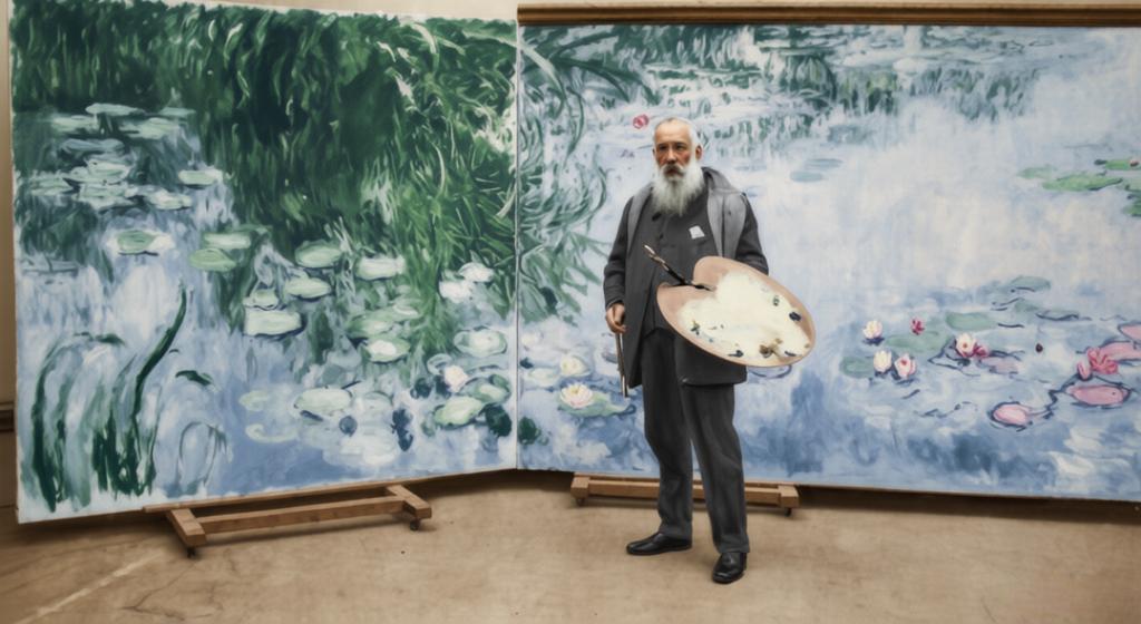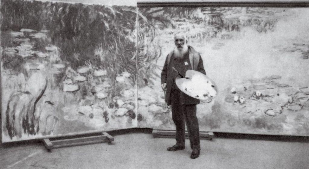 这张照片是印象派大师克劳德·莫奈晚年在吉维尼画室的珍贵留影,拍摄于他创作巨型《睡莲》系列壁画的时期。 莫奈站在巨幅《睡莲》画布前,手持调色板,此时他已饱受眼疾困扰,却仍在以近乎失明的状态坚持创作。这些作品是他晚年最重要的艺术成就,最终捐赠给法国巴黎的橘园美术馆,成为印象派艺术的巅峰之作。