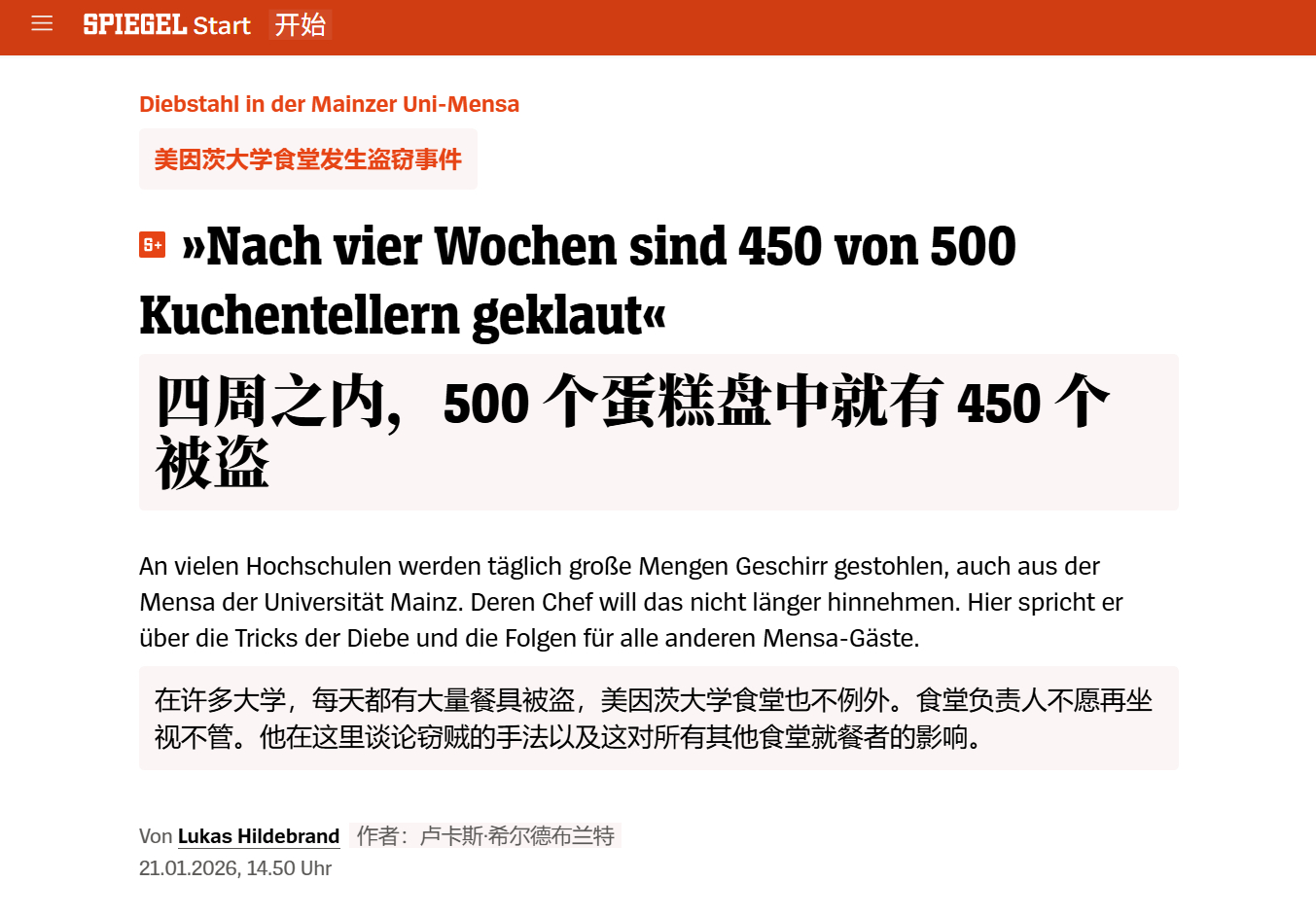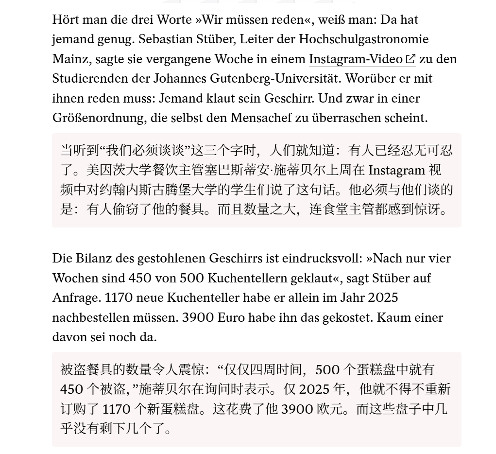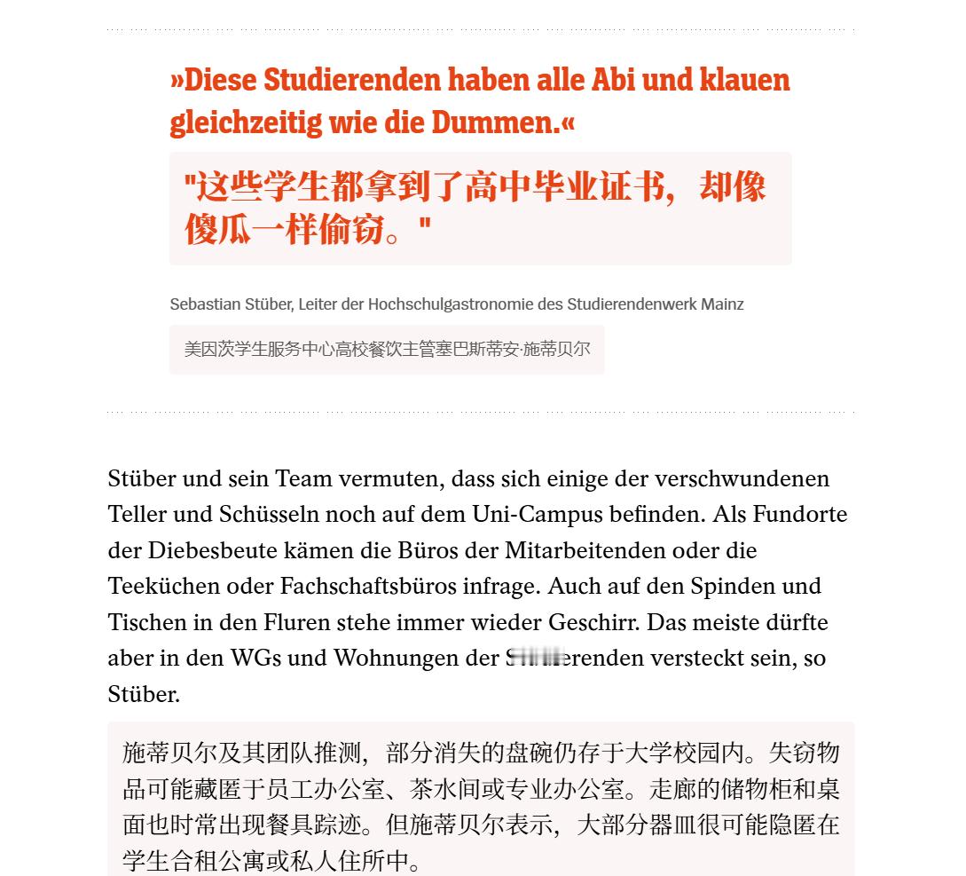 🔻德国《明镜周刊》:美因茨大学食堂爆出长期盗窃案,'四周内500个蛋糕盘中