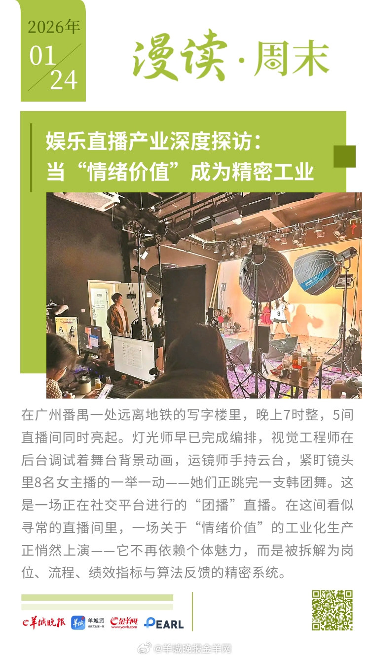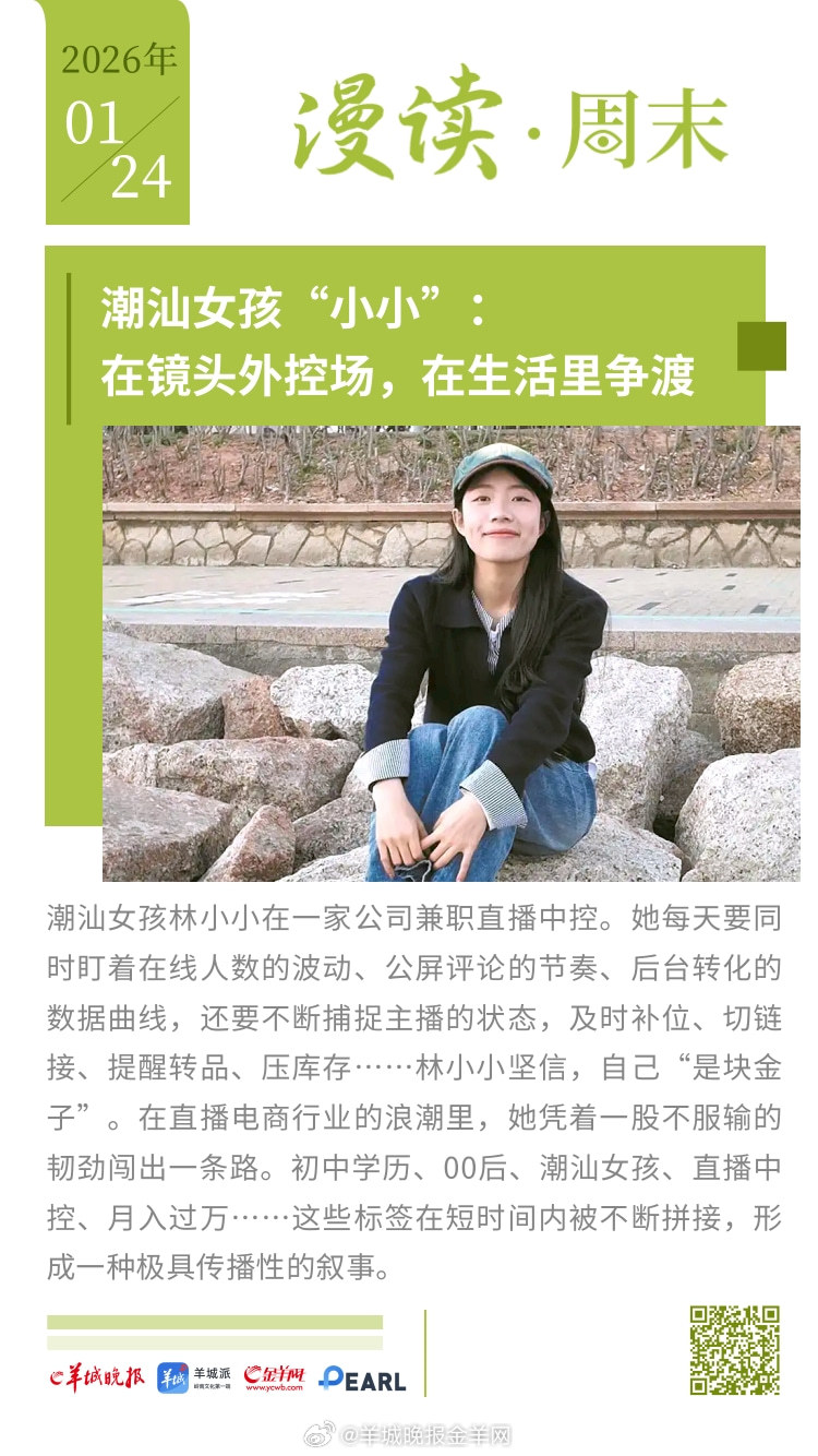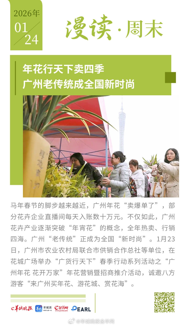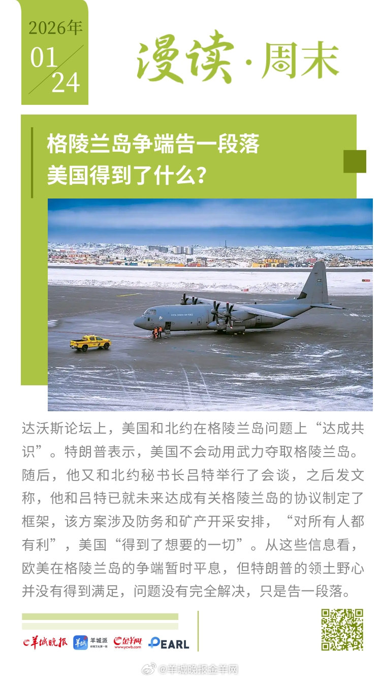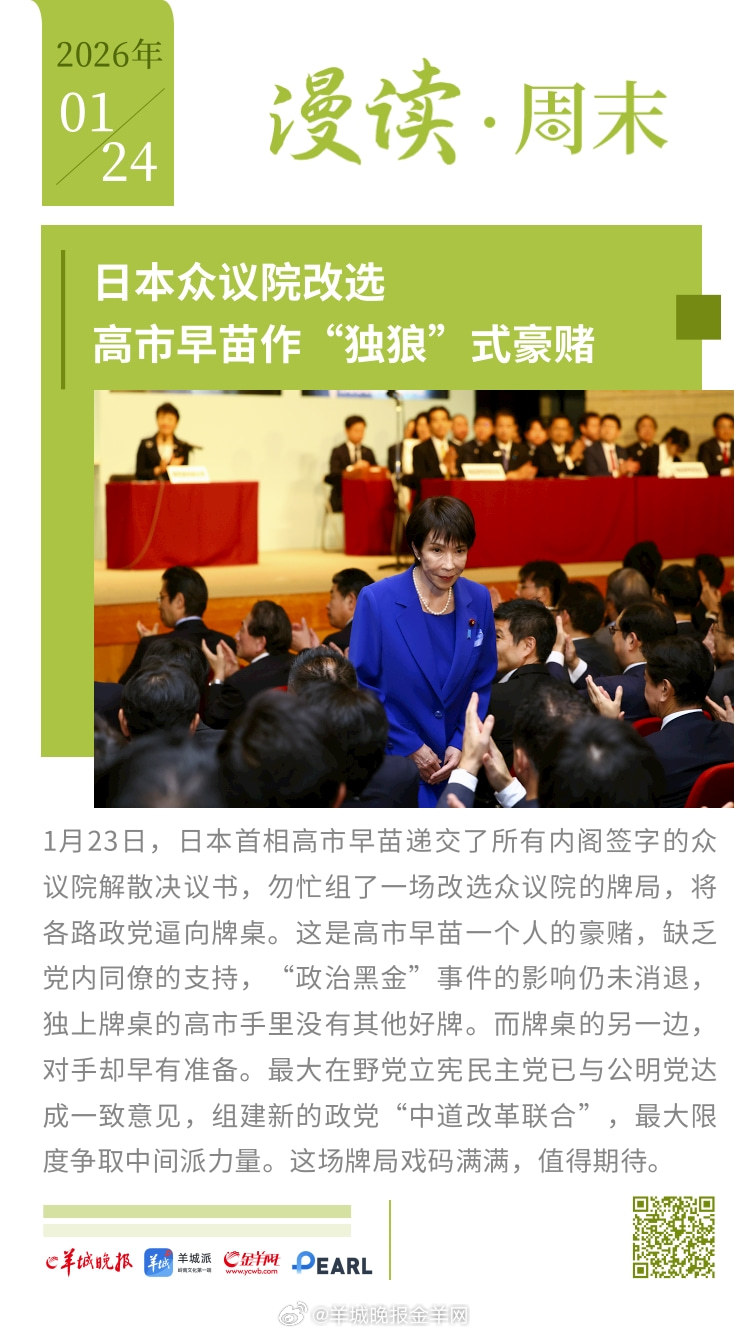 #漫读周末# 格陵兰岛争端告一段落,美国得到了什么?日本众议院改选,高市早苗作 "独狼"式豪赌;潮汕女孩“小小”:在镜头外控场,在生活里争渡;深圳网友危一:全网刷屏作文中的“好姨夫”;娱乐直播产业深度探访:当“情绪价值”成为精密工业;年花行天下卖四季,广州老传统成全国新时尚。#女子戴透视隐形眼镜打麻将被抓##U23国足说没什么包袱就是想赢# 更多精彩报道,请扫码关注羊晚全媒体报道!