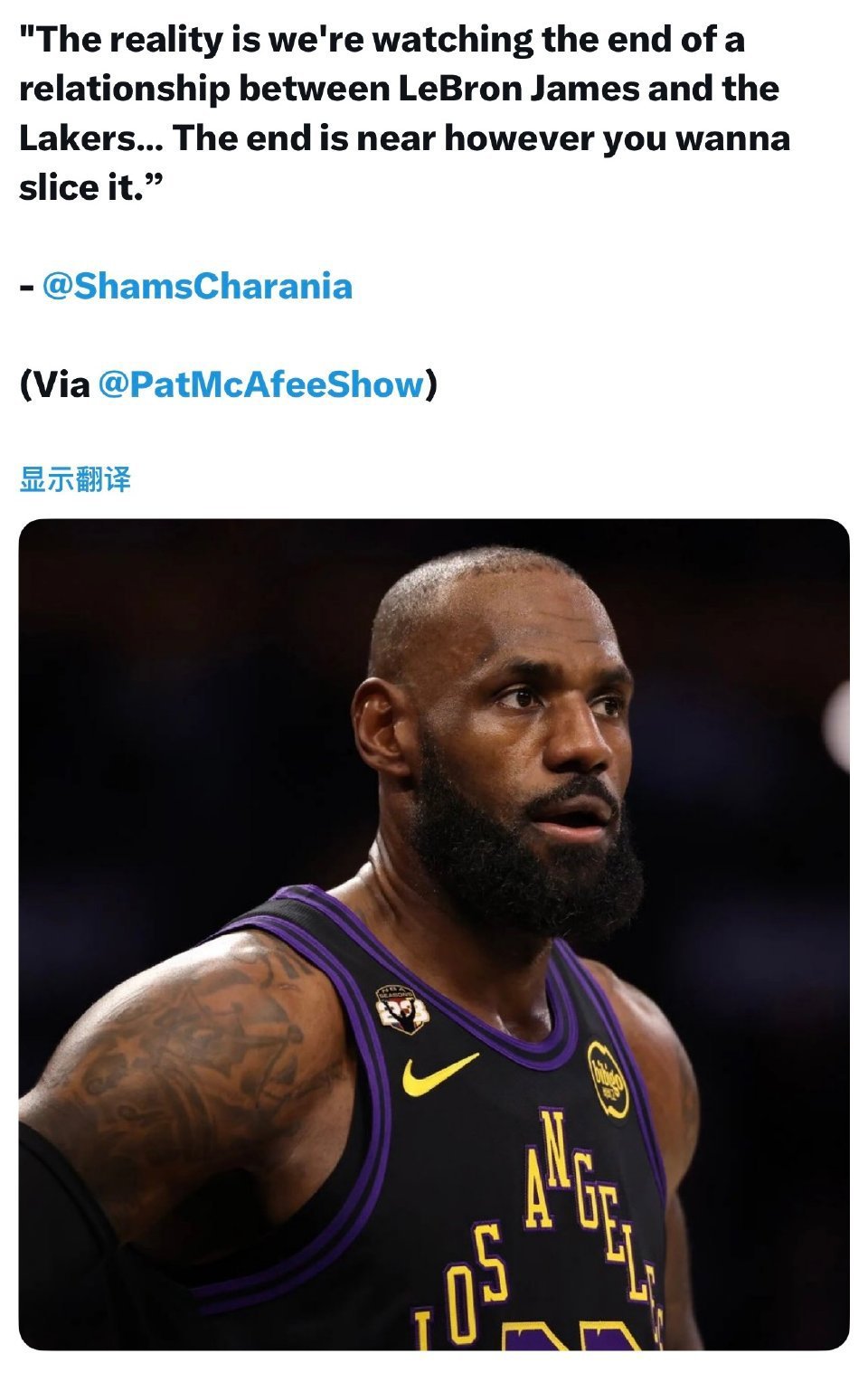 Shams:“我们正在见证詹姆斯和湖人关系走向终点。不管你怎么解读,结局都已近在眼前。”