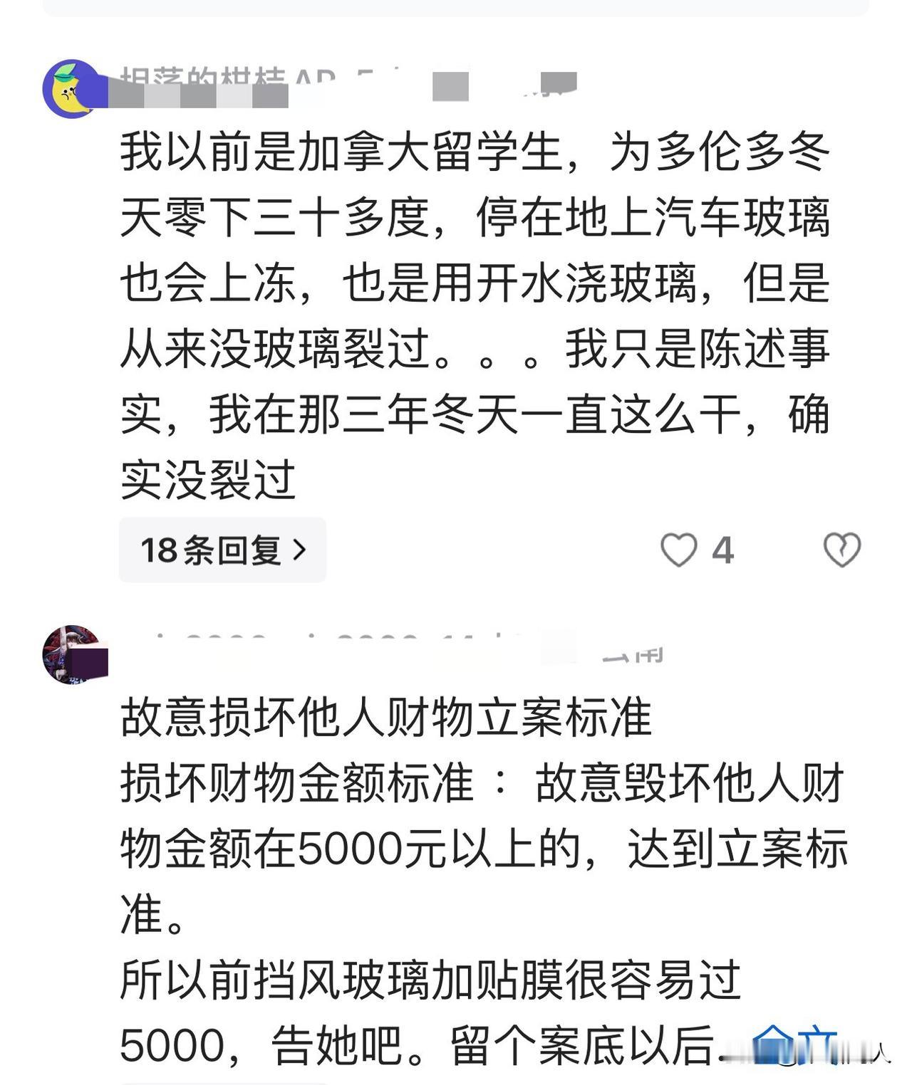 明坏和蔫坏加在一起等于无耻,看看他们做的是人事吗? 近日一个女人为了验证“开水浇挡风玻璃会炸”是假的,就在街上随机选了一辆车,把一壶开水浇到了挡风玻璃上。 玻璃瞬间炸裂了,旁观者问她为什么不用自己的车做实验?这个女人笑着回答“:别人的车我只用花钱就能解决,用自己的车不仅要花钱还心疼车。” 看看这个女人是多么的无耻,这还不算,她还有同类在评论区下面误导网友们,他一本正经的说: “我以前是加拿大留学生,多伦多冬天零下三十多度,停在地上汽车玻璃也会上冻,也是用开水浇玻璃,但是从来玻璃没有裂过。我只是陈述事实,我在那三年冬天一直这么干,确实没裂过。” 这段评论如果被没有经历过严寒天气的网友们信以为真,拿来照做自己的爱车就会受到损害,可见这位网友的用心不良,这样的人在东北,我们叫做蔫坏。 一个肆无忌惮的做坏事,一个用心险恶的误导网友,看看他们多么无耻,这是人应该干的事吗? 最后我给大家科普一下,热胀冷缩的力量无穷大,无论是外国汽车玻璃还是国产汽车玻璃,无论质量多么好,在严寒的天气中,只需要一壶热水就会炸裂。 大家千万不要心存侥幸尝试这么做,汽车玻璃上霜只需要打开热风,慢慢就会化开。哎林子大了什么鸟都有,大家一定要擦亮眼睛,明辨是非呀!