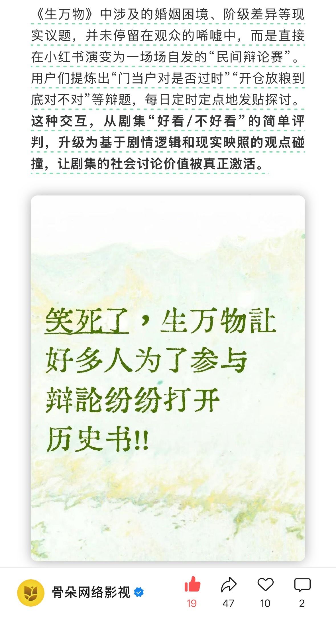 杨幂生万物 【骨朵网络影视——2025剧集爆款观察】特别提到《生万物》中涉及的婚姻困境、阶级差异等现实议题,并未停留在观众的唏嘘中,而是直接在小🍠演变为一场场自发的“民间辩论赛”。用户们提炼出“门当户对是否过时”“开仓放粮到底对不对”等辩题,每日定时定点地发贴探讨。这种交互,从剧集“好看/不好看”的简单评判,升级为基于剧情逻辑和现实映照的观点碰撞,让剧集的社会讨论价值被真正激活。