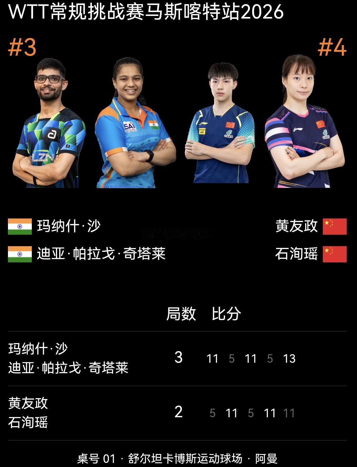 黄友政石洵瑶2比3印度组合2026年WTT常规挑战赛马斯喀特站混双决赛上演巅峰对决,中国组合黄友政/石洵瑶与印度组合玛纳什·沙/奇塔莱展开五局鏖战,最终以2-3憾负对手,斩获赛事银牌。整场比赛跌宕起伏,比分交替攀升,五局较量的具体比分依次定格为5-11、11-5、5-11、11-5、11-13,双方在攻防转换间尽显竞技张力,中国组合虽奋力拼搏、两度追平比分,却在决胜局关键分争夺中遗憾告负。黄友政石洵瑶混双银牌黄友政石洵瑶2比3印度组合