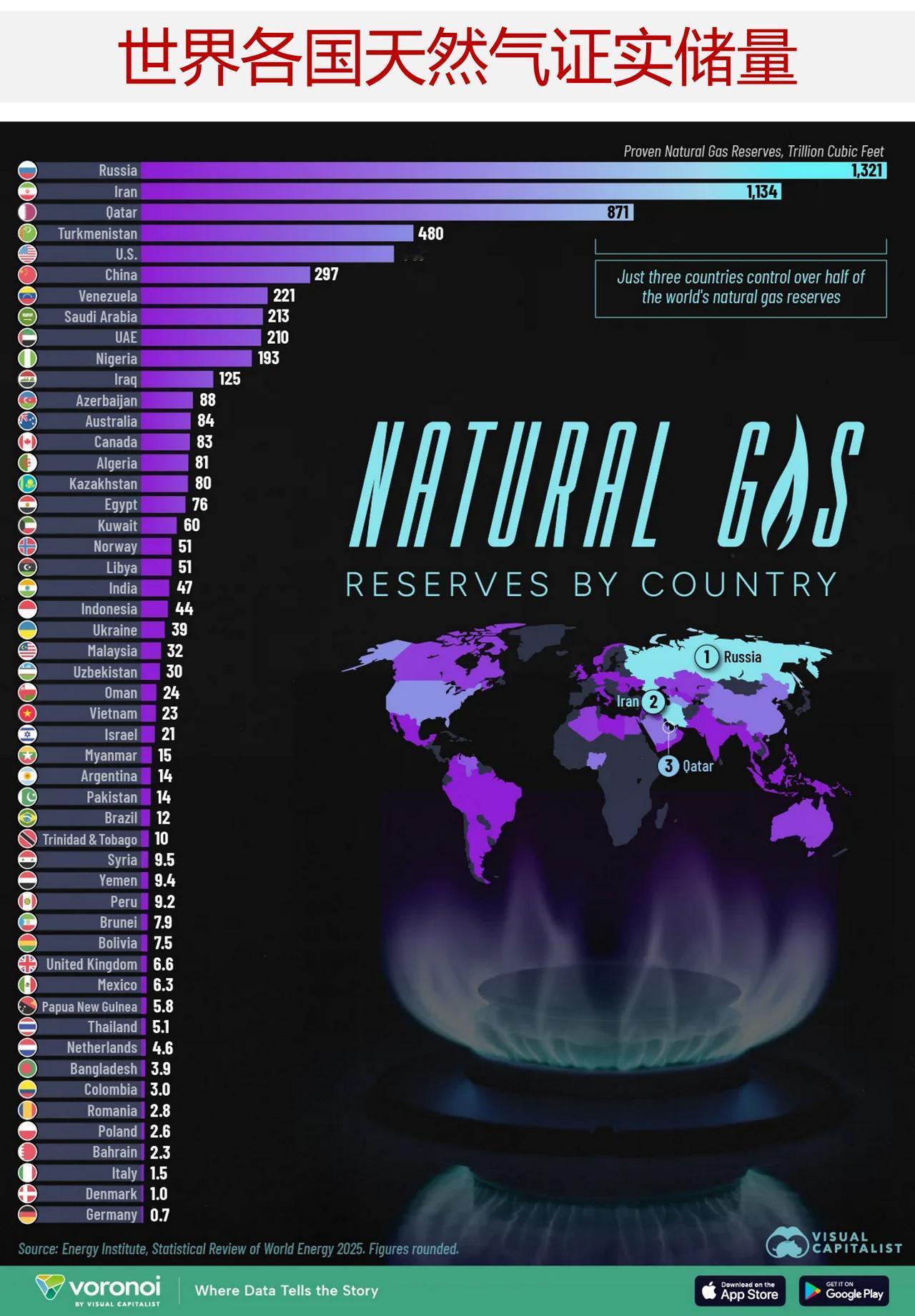 图说世界各国天然气储量情况,来看看天然气储量最多的国家是哪个? 天然气在全球能源体系中发挥着至关重要的作用,用于电力生产、家庭供暖以及支持工业活动。尽管天然气得到了广泛使用,但全球的天然气储量分布却极不均衡。 下面图表按照各国天然气证实储量(以万亿立方英尺为单位)对各国进行排名。该图表的数据来源于英国能源研究所的《2025 年世界能源统计概览》。 ——少数几个国家掌控着全球天然气储量 仅有三个国家——俄罗斯、伊朗和卡塔尔——掌控了全球天然气证实储量的一半以上。仅俄罗斯就拥有超过 1300 万亿立方英尺的天然气储量,使其成为全球拥有天然气储量最多的国家。 在俄乌战争之前,欧盟约 40%至 45%的天然气进口来自俄罗斯,但截至 2025 年中期,这一比例已降至约 13%至 19%。 ——中东和欧亚地区领先 除了排名前三位的国家之外,诸如土库曼斯坦、沙特阿拉伯、阿拉伯联合酋长国以及伊拉克等国家也使中东和中亚在全球天然气储量方面占据了优势地位。 这些地区拥有储量巨大且成本低廉的天然气资源,能够支撑长期的生产活动,因此在全球液化天然气(LNG)出口领域占据着核心地位。 ——美国和中国属于天然气储量大国 美国在全球排名第五,其天然气储量约为 446 万亿立方英尺,这反映了过去二十年间页岩气开发所产生的影响。 中国也位列其中,但其国内需求十分庞大,即便拥有大量天然气储量,其进口仍占据着重要地位。 ——规模较小的生产国在地区层面仍具有重要意义 拥有较少天然气储量的国家——包括挪威、英国以及其地理位置靠近主要需求中心的国家。荷兰——由于现有的基础设施,将继续在地区天然气市场中发挥重要作用。 然而,欧洲部分地区石油储量的减少凸显了该地区对进口的日益依赖。