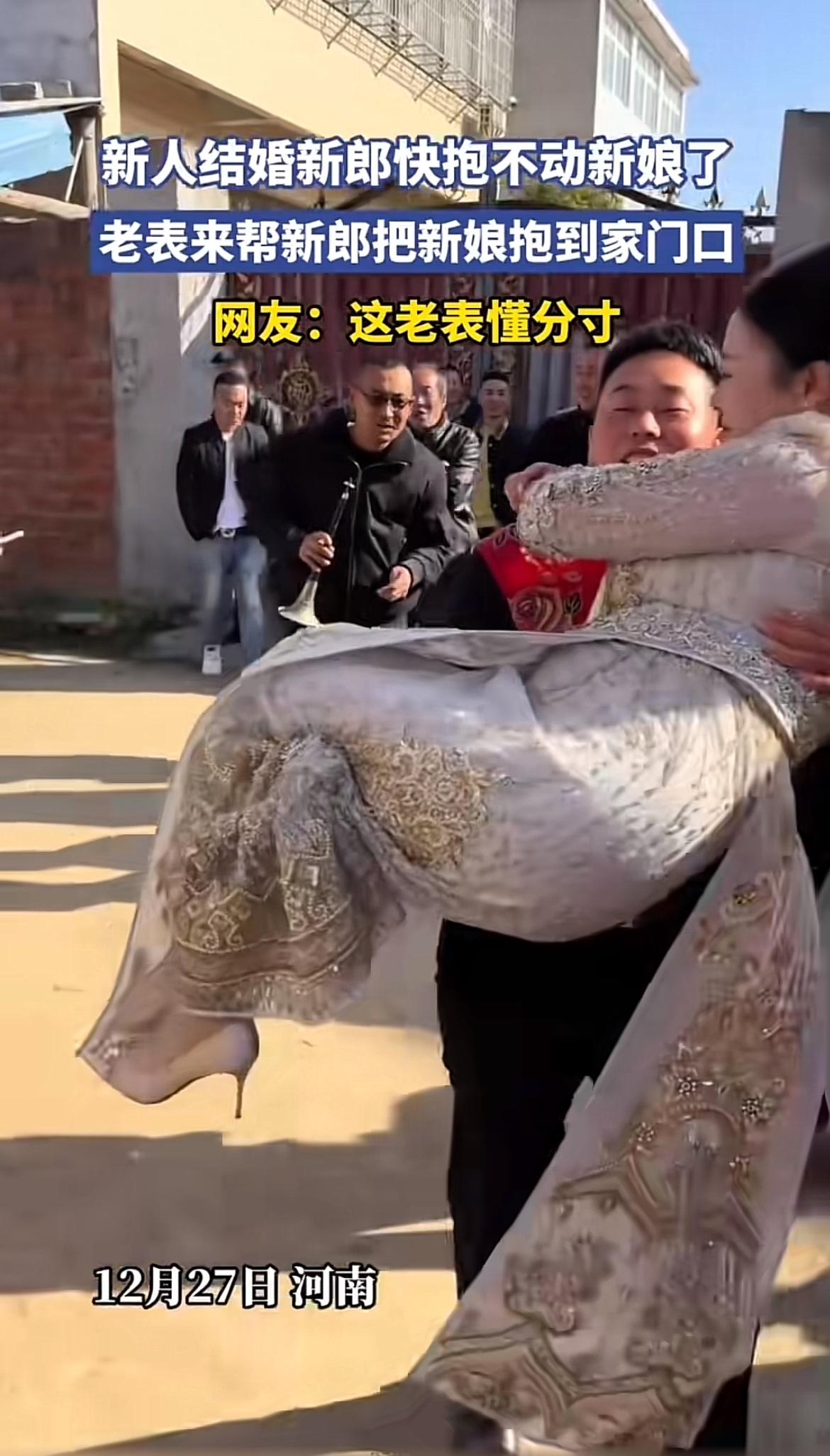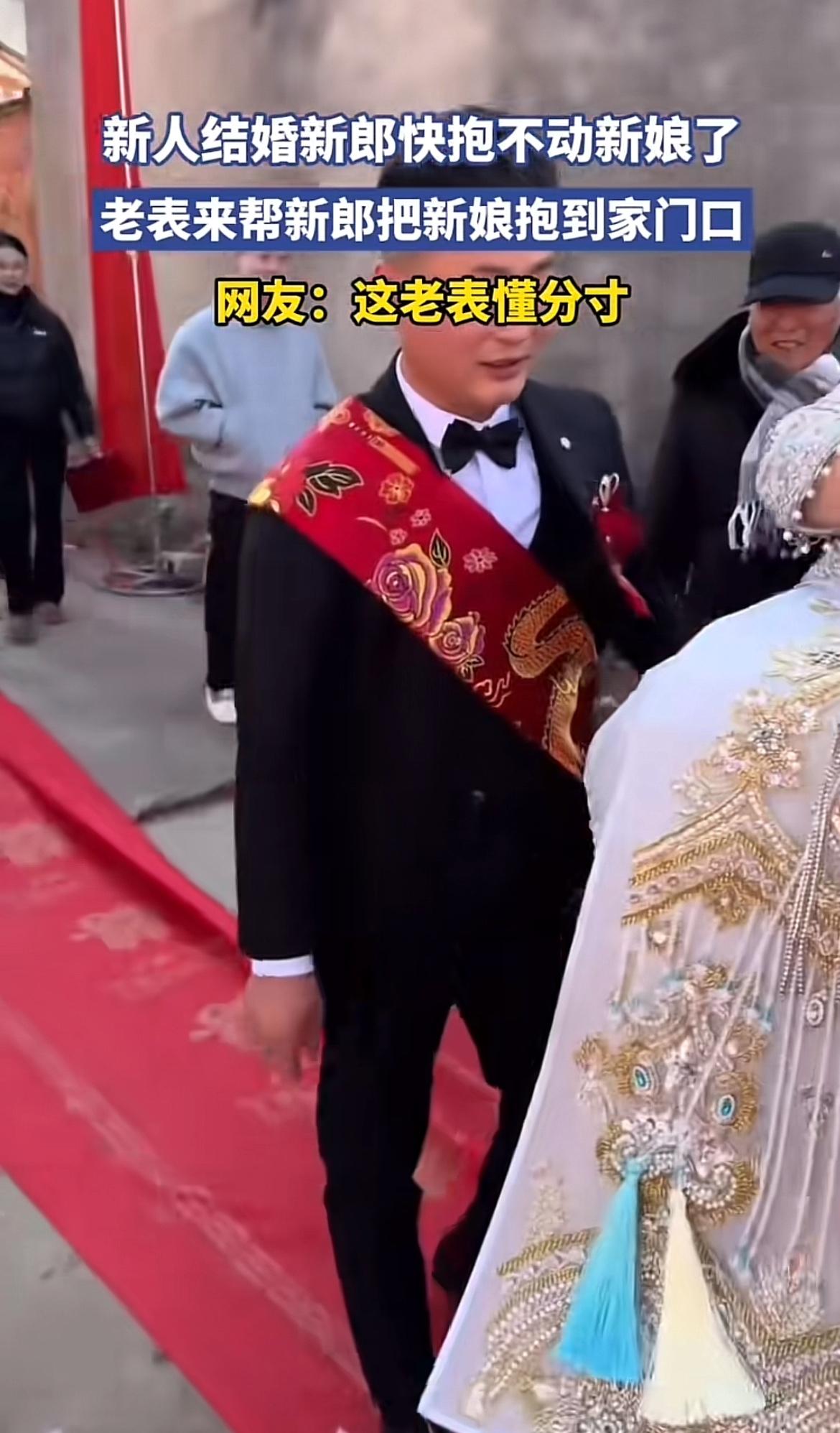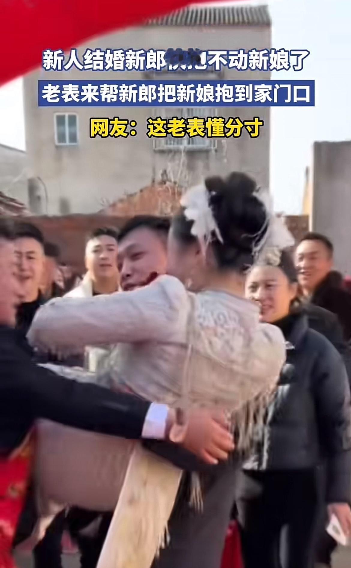 现在新人结婚总有各种有趣的环节。看到有个视频,新人结婚时老表帮忙抱新娘到家门口。这老表抱得那叫一个稳,而且分寸感把握得超棒。既有力气稳稳地把新娘抱到目的地,又没有任何不合适的举动。 这年头,结婚帮忙的事儿不少,但能像这老表一样懂分寸的可不多。很多时候帮忙可能就容易乱了分寸,引起不必要的麻烦。不得不说,这个老表太靠谱了,给婚礼添了一份和谐与美好,也难怪网友都夸他呢!