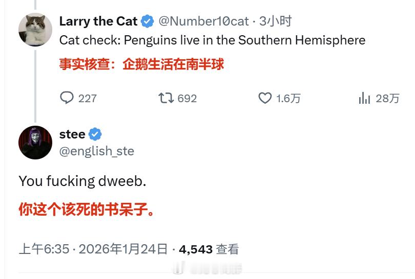 美国白宫官方帐号发了一张图片,显示特朗普和一只举着美国国旗的南极企鹅走向格陵兰岛……但问题是格陵兰岛在北半球……评论区有网民指出这一点之后,立刻遭到MAGA的抨击……行吧,到时候白宫发言人可以狡辩那企鹅是特朗普从动物园里“特赦”出来的。(唉,堂堂一国政府的官号……)海外新鲜事 白宫发特朗普在格陵兰岛牵企鹅