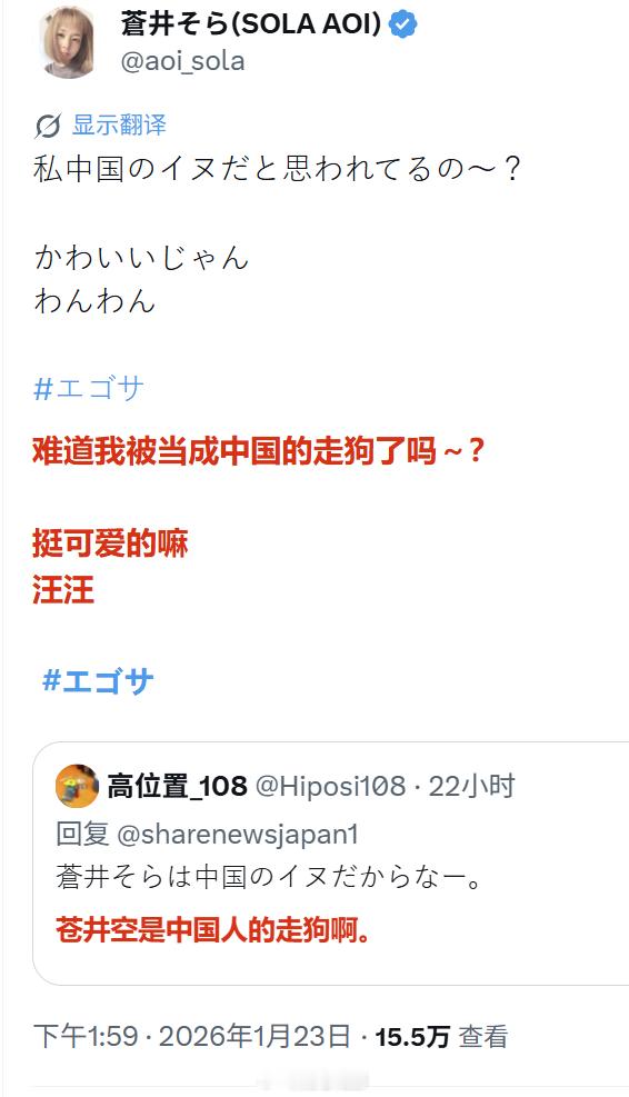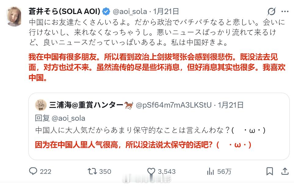 苍井空前几天因为说了句“喜欢中国”而遭到日本右翼围攻,到目前双方已经纠缠+论战多日。有右翼指责“就因为你,日本女性在中国都被戴上有色眼镜看待了”,还说她“是中国人的走狗”。海外新鲜事