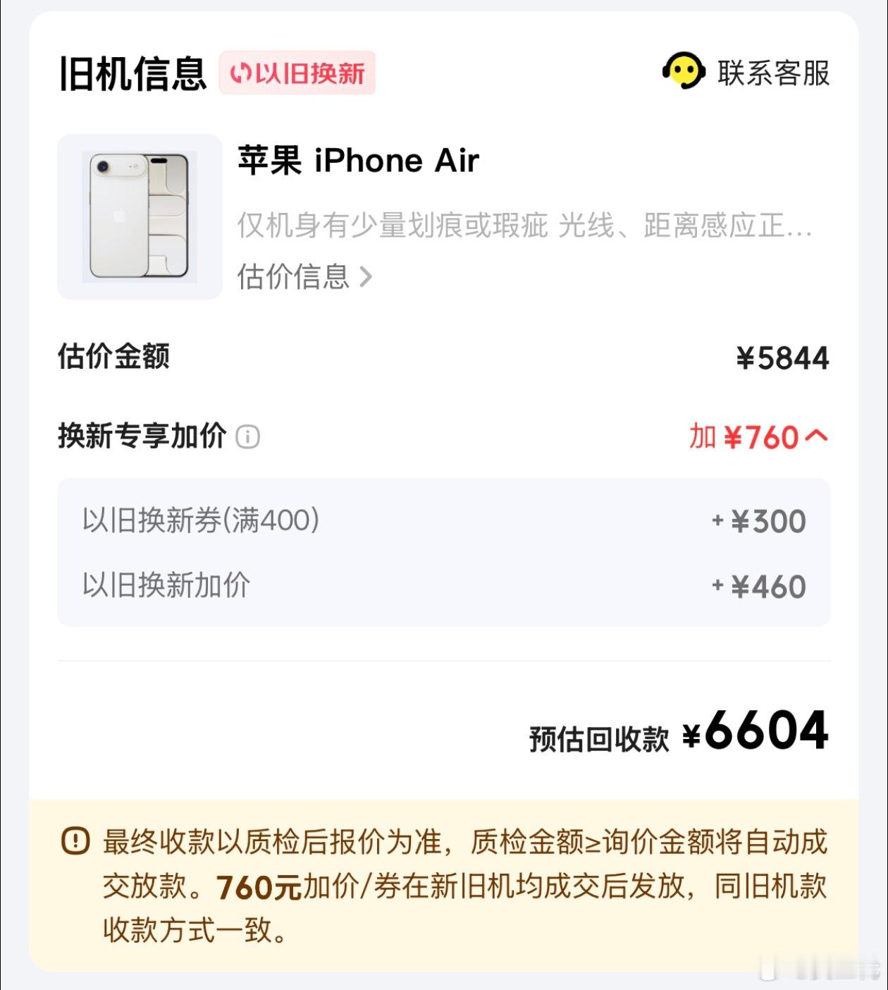 趁着东哥还没反应过来,昨晚用iPhone Air以旧换新到17 Pro了。千算万算能立减2000元我是没想到的,三个月从9999元降到了7999元,首发用户很难受512G版本Air置换到17 Pro,东哥补贴760,加上焕新券,相当于二手卖了5844+760=6604+500=7104元(新机7999元),希望不要出幺蛾子