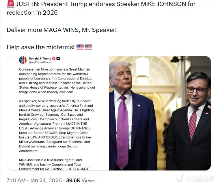 特朗普总统支持议长迈克·约翰逊在2026年的竞选莲荏。