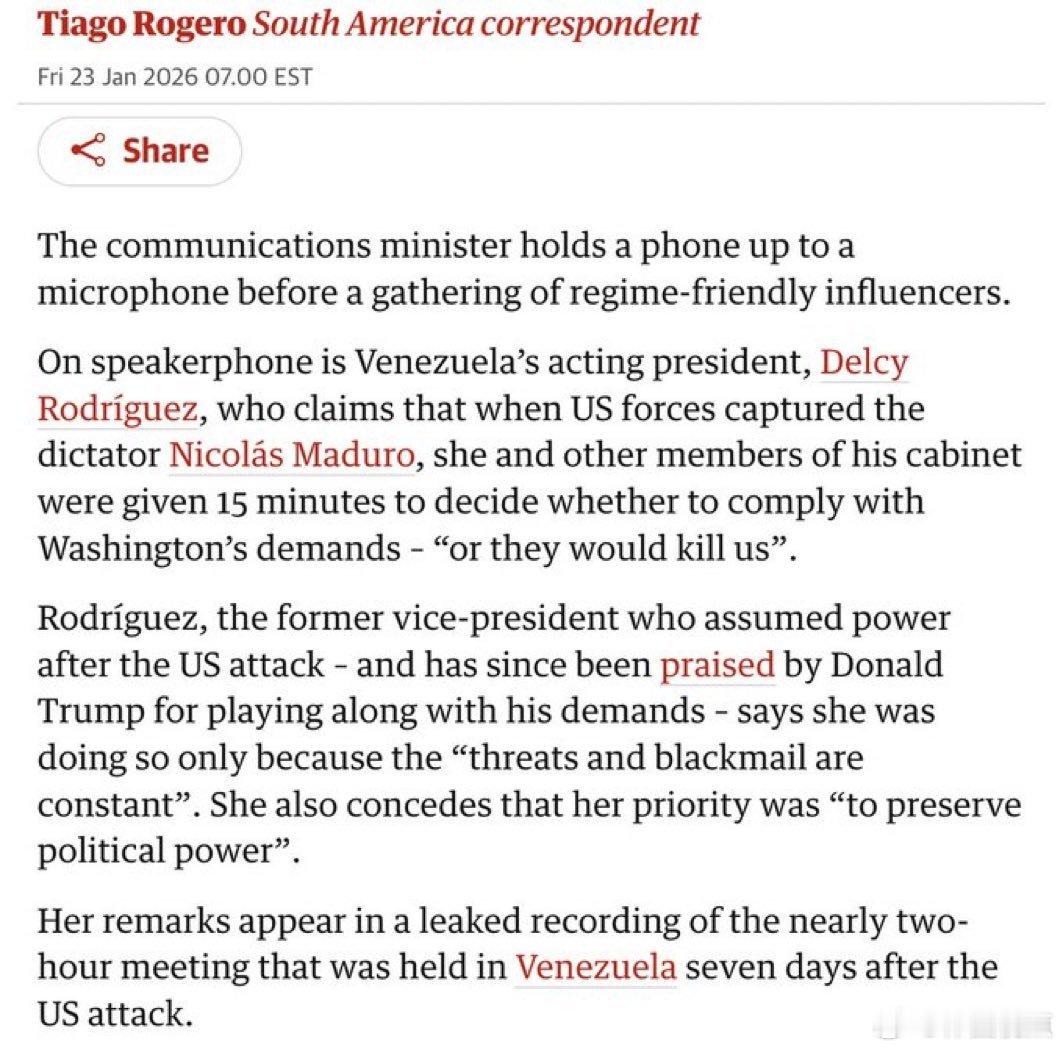 萎内睡拉新任代理总统德尔西·罗德里格斯声称,在尼古拉斯·🐎杜罗被美军抓获后,美军告诉她,她只有15分钟时间决定是否愿意与美国合作,如果回答“不”,她将会被“干掉”。她的这番话出现在一段泄露的视频中,但美国官方尚未确认这一具体说法。