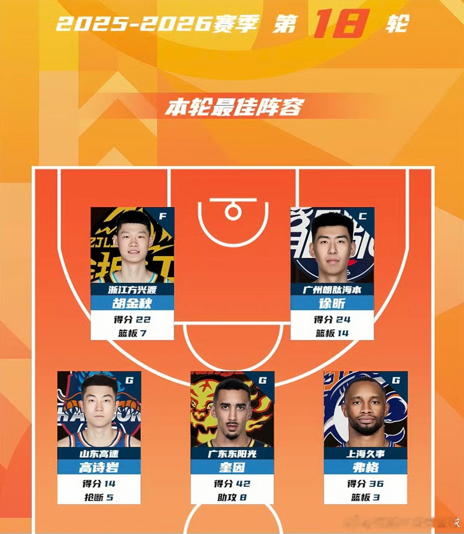 CBA第18轮最佳阵容出炉!奎因42分登顶,徐昕24+14闪耀入选CBA官方官宣第18轮最佳阵容,广东宏远外援奎因与广州队徐昕携手入选,奎因更是以单场42分成为本轮得分王,徐昕则凭借24分14篮板的统治级内线表现强势上榜!奎因:42+7+8攻防一体,成广东赢球核心本轮广东对阵吉林的比赛中,奎因打出封神表现,全场砍下42分7篮板8助攻4抢断的豪华数据,第三节单节狂轰17分,直接打垮对手反扑势头,带领广东21分大胜。他不仅以42分登顶本轮得分榜,攻防两端的全能发挥也让其毫无悬念入选最佳阵容,堪称广东现阶段的绝对核心。徐昕:24+14统治加时,内线表现惊艳广州对阵同曦的加时大战里,徐昕迎来生涯高光,出战33分钟10投9中,罚球6中6,砍下24分14篮板2盖帽,加时赛独得8分,几乎以一己之力率队取胜。超高命中率+统治级篮板表现,让这位22岁中锋成为本土内线亮点,成功跻身最佳阵容!广东宏远广东宏远