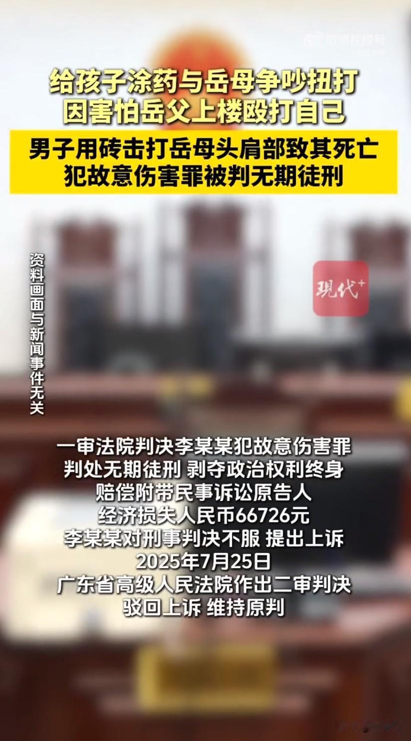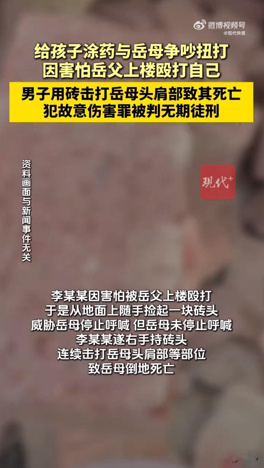 一桩因孩子涂药引发的家庭口角,最终酿成了无可挽回的悲剧,上门女婿李某某因一时冲动,用砖头砸死岳母,最终被判处无期徒刑,好好一个家就这样彻底散了。李某某入赘岳母家多年,平日里就常因孩子教育、日常开销等小事和岳母闹矛盾,日积月累下来,心里本就藏着不少积怨,只是没爆发出来。那天在家中,两人又因为给儿子涂药的事吵了起来,一开始只是各说各的理,语气越来越冲,没过多久就从口角之争升级成了推搡扭打,互相拉扯间情绪都彻底失控。争执中,岳母气不过,朝着楼下大声呼喊岳父的名字,想让丈夫上来帮忙。这一喊彻底慌了李某某,他一直怕岳父,总觉得岳父向来偏袒岳母,要是上来肯定会动手殴打自己,慌乱之下,他随手从地上捡起一块砖头,举起来威胁岳母,让她别再喊了。可正在气头上的岳母根本没停,依旧大声呼喊,李某某被恐惧和怒火冲昏了头脑,完全丧失了理智,握着砖头就朝着岳母的头肩部狠狠砸了下去,一下又一下,丝毫没有收手,直到岳母倒在地上没了动静,他才猛地回过神。看着倒在血泊中的岳母,李某某彻底慌了神,冷静后他知道自己闯了大祸,没有选择逃跑,而是主动驾车到当地派出所投案自首,如实供述了自己的罪行。事后经调查,岳母因头部、肩部受重创,当场死亡,这场因小事而起的争吵,最终酿成了天人永隔的惨剧。法院审理时查明,两人长期存在家庭矛盾,但此次悲剧的发生,根源是李某某没能理性处理冲突,还采取了极端暴力手段,即便有自首情节,也难辞其咎。最终法院以故意伤害罪,判处李某某无期徒刑,剥夺政治权利终身,同时判令他赔偿死者家属相应的经济损失。李某某不服一审判决提出上诉,二审法院审理后,认为原判量刑适当,驳回了他的上诉,维持原判。这件事传开后,不少人都唏嘘不已,不过是给孩子涂药的小事,但凡双方各让一步,好好沟通,也不会闹到这般地步。可生活里总有很多人,遇到矛盾就控制不住情绪,把小事闹大,把口角变成暴力,最后不仅害了别人,也毁了自己和整个家庭,原本和睦的一家人,就因为一时的冲动,落得家破人亡、身陷囹圄的下场。 来源:现代快报