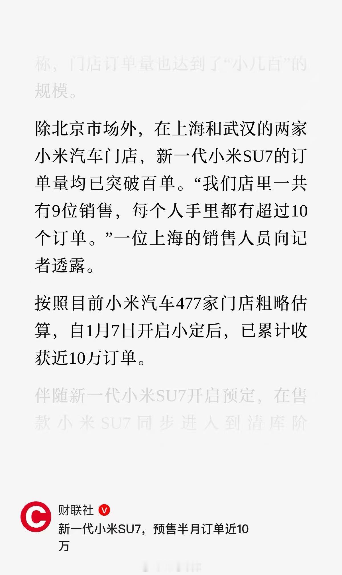 财联社:新一代 SU7 预售半个月,订单(小订)近 10 万。北京重点商圈的门店,预订突破 400 单,相对偏远的门店,也有小几百的规模。新一代 SU7 依然这么火?42how新能源汽车