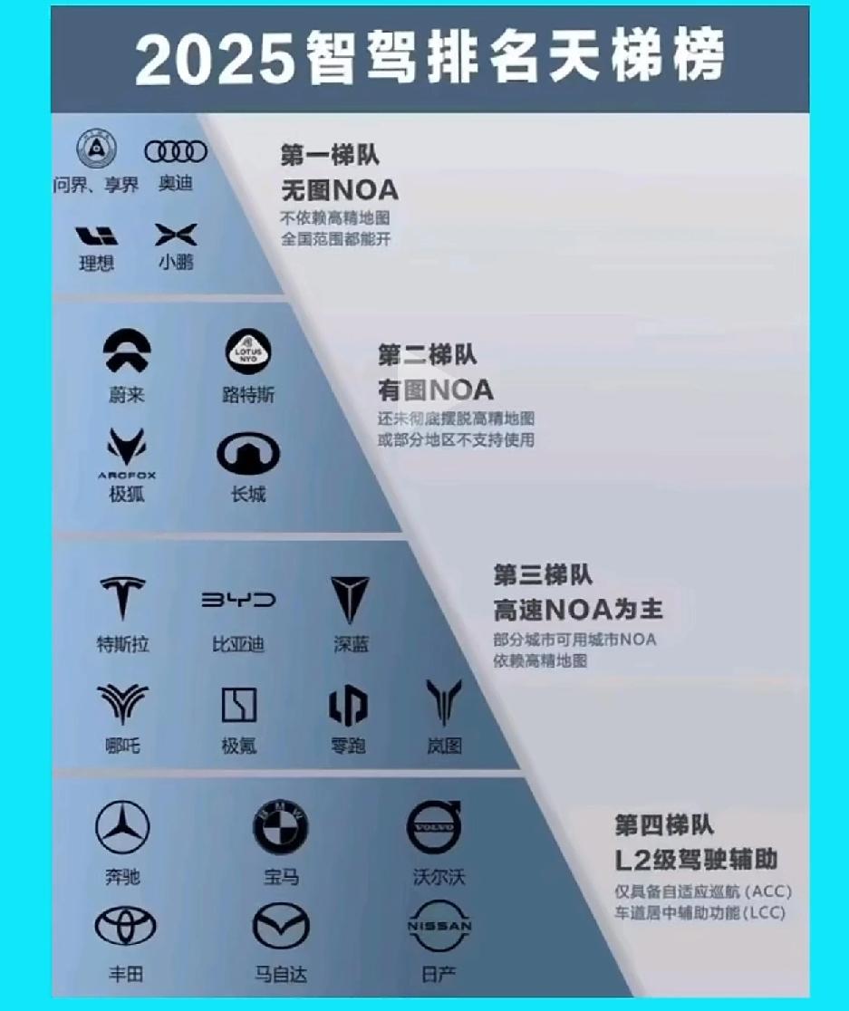 2025年智驾排行榜,对这个排行榜你认可吗,总体还是只对一半吧[捂脸],问界,理想,小鹏是属于第一梯队,但这个奥迪是咋来就有点莫明其妙[捂脸],谁懂给说道说道,本人最看好华为自驾和理想自驾,二家都足够资金与数据实力,特别是华为,2026年还存在变数应该就是特斯拉的FHD,听说今年要进来了,而且是在上半年,相信到时它的价格也会一下降的很厉害! L2++智驾 智驾智能驾驶 华为智驾 智能驾驶排名 智驾测评 高阶智驾测试 智驾体系 汽车智驾测试 燃油智驾排行榜 智驾算力排行榜 智驾产业链 智驾排名 智驾白皮书 智驾排行榜 fsd智驾 高智驾比 汽车智驾 特斯拉智驾 智驾对比 智驾驾驶 智驾渗透率 智驾AI 智驾分级