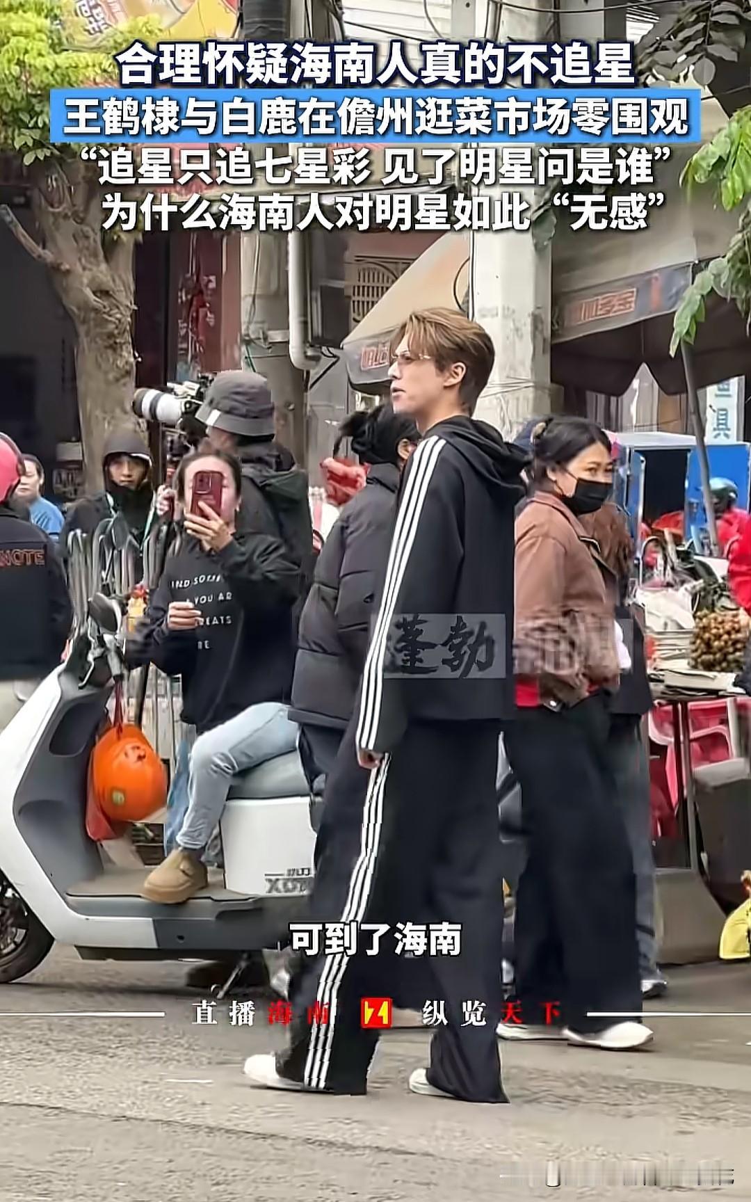 海南人真的不追星吗?最近,王鹤棣与白鹿在海南儋州逛菜市场,结果现场零围观!没有人在乎她们是谁,就连保安都省了,海南人没有像其他省的粉丝那样围追堵截。有人说追星的那波人都在上学,也有人说“只有砂糖橘十块钱八斤,海南人才会上去围!” 其实吧,不是海南人不追星,而是忙碌的人没有那个工夫追星,各省都一样。每个人的追求不一样,不追星的人本身就对明星祛魅了的,都是普通人,明星都是包装出来的,就算去追星,她们能给我钱吗,能和我唠嗑吗?所以这一点海南做得非常好。 再者就是海南的宣传无论是景色,还是特产,宣传力度都永远大于偶像的,海南有哪些明星艺人,很多人说不上三个。所以海南人对明星基本都是无感的。