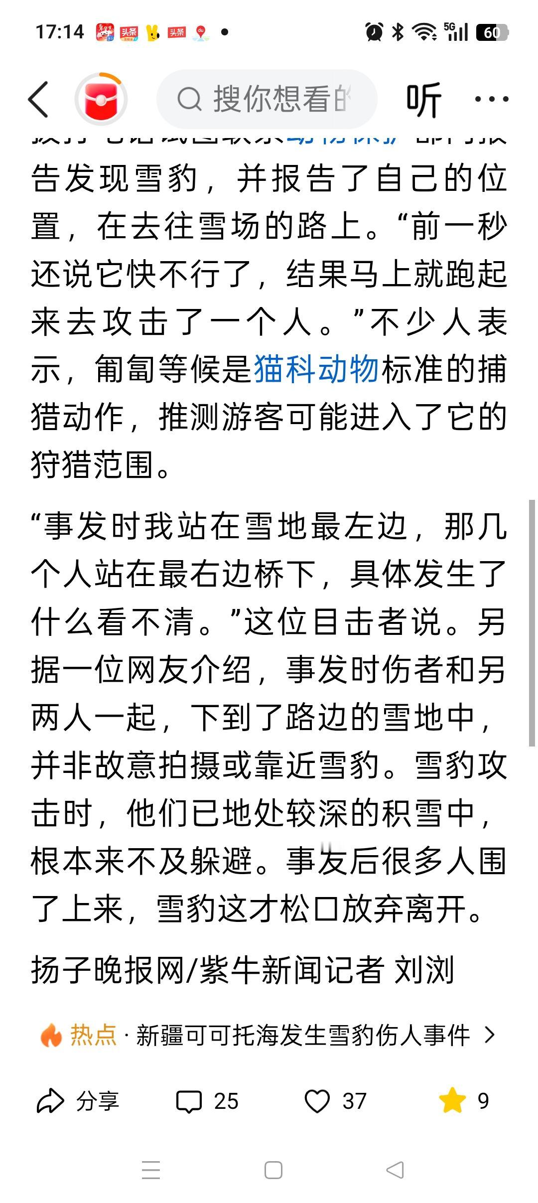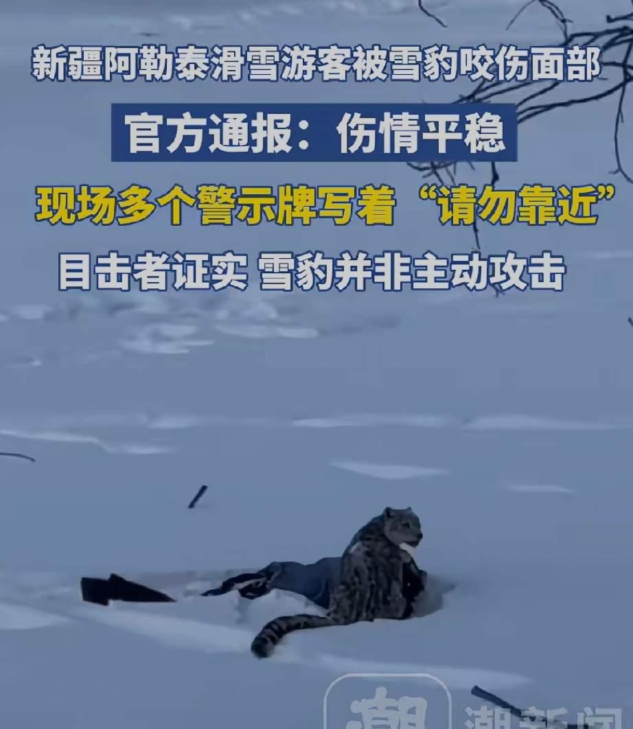新疆女游客被雪豹抓伤,不是女游客主动靠近观看,也不是雪豹要主动伤人,可能女游客不小心进入了它的狩猎范围。 据现场目击者透露:当时雪豹已经一动不动趴在雪里有10分钟了,他们正准备打电话告知工作人员。没想到有3个人正好从附近经过,雪豹就冲了过去,根本来不及躲避。 最后也是大家鼓起勇气,一起向雪豹靠近,试图救回女游客,雪豹才松口离开。 所以网上的那些说法并不准确,大家都有基本的常识,不可能去主动接近雪豹。 这名女游客是幸运的,遇到了很多热心群众,捡回了一条命,要感谢他们[祈祷][祈祷]
