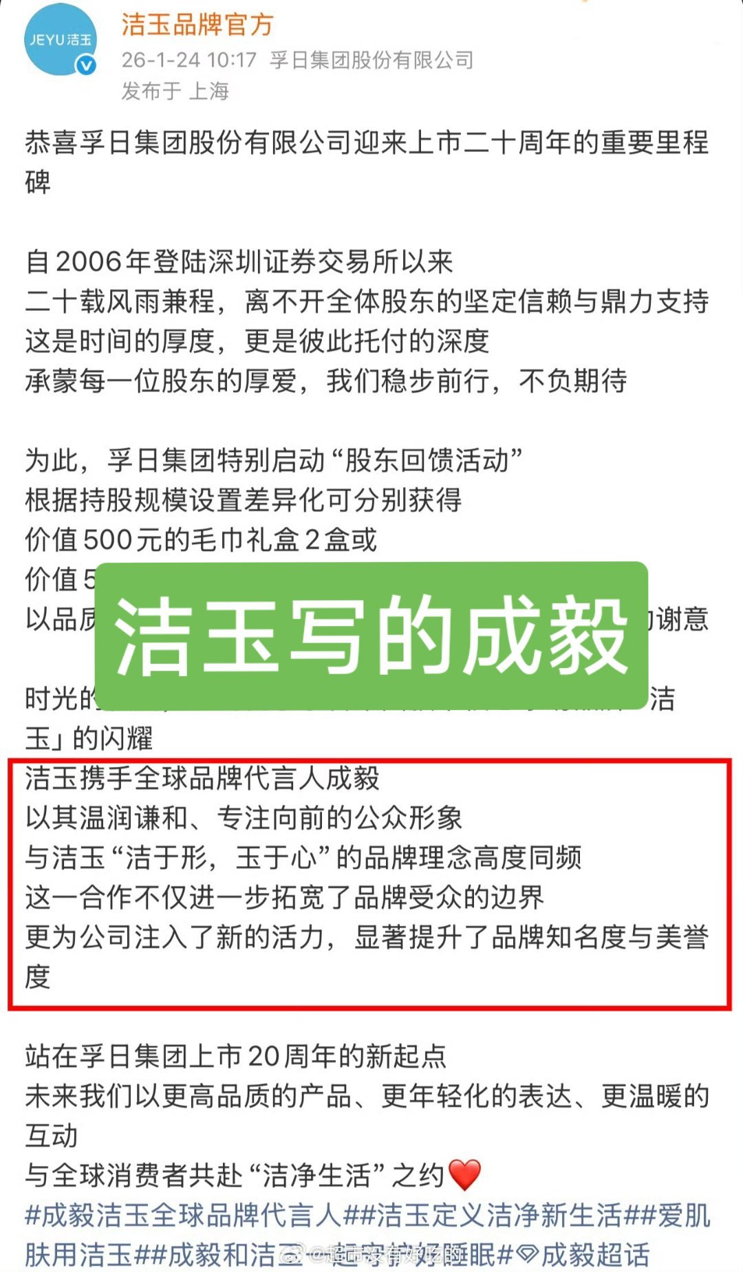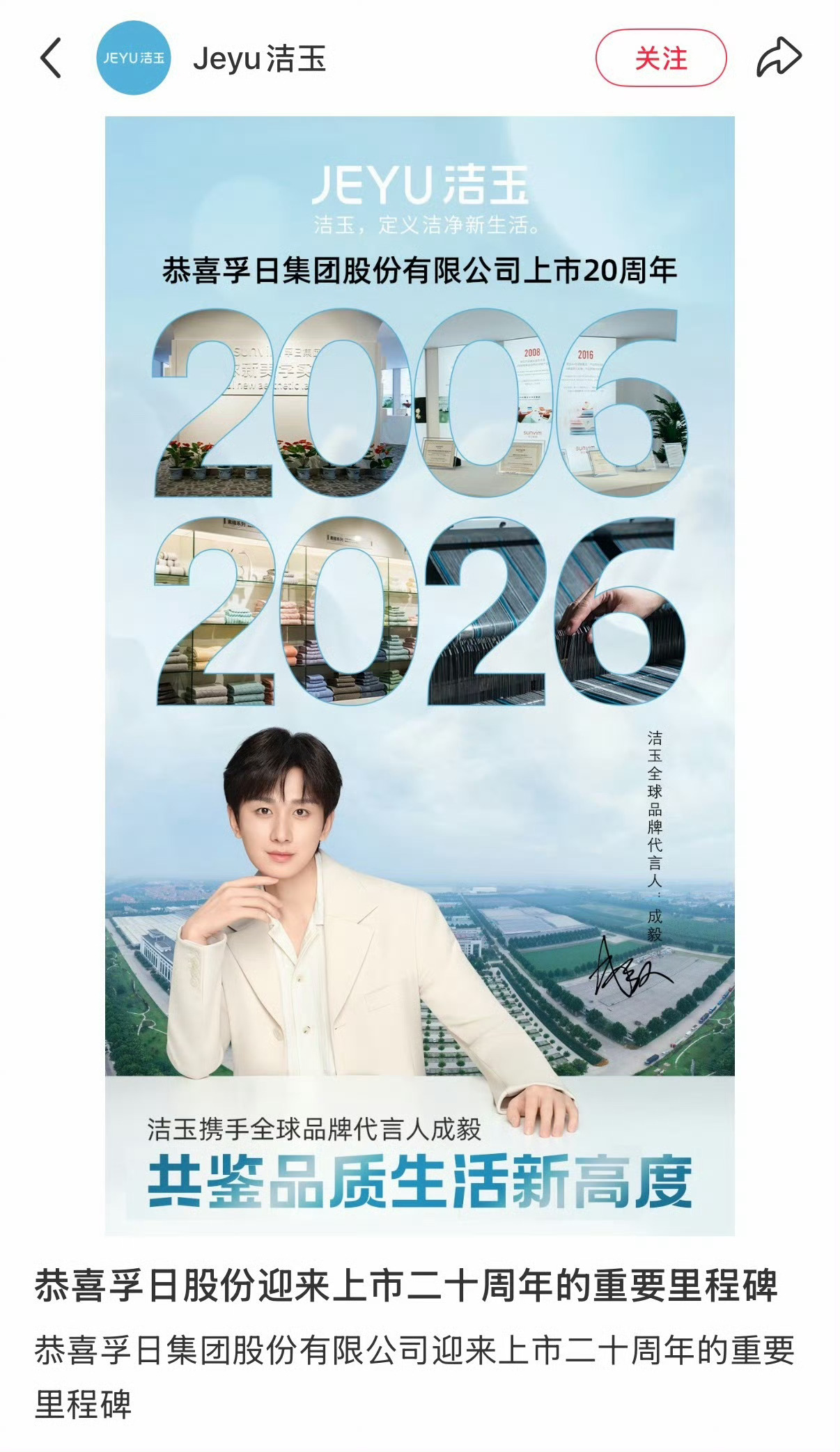 品牌洁玉对成毅的认可,显示了成毅强大的商业价值,成毅值得。💚💚💚恭喜孚日股份迎来上市二十周年的重要里程碑。🎉