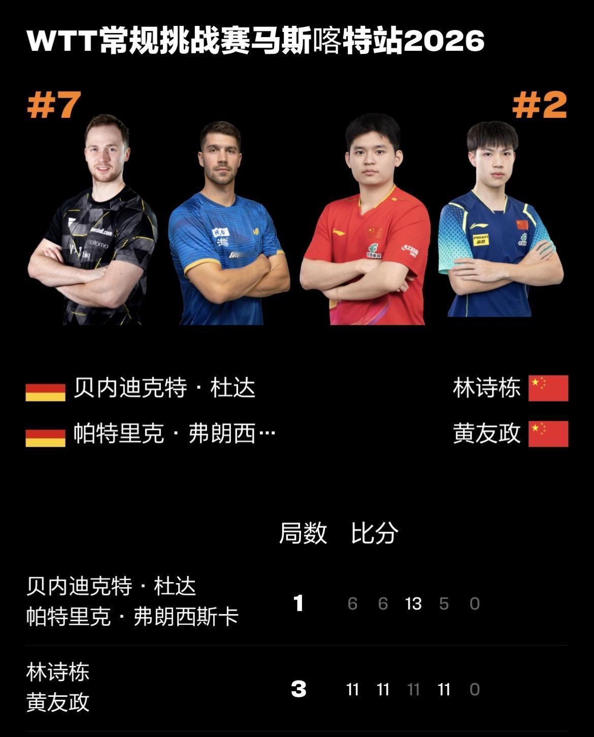 WTT常规挑战赛马斯喀特站丨男双决赛 林诗栋/黄友政🇨🇳3-1弗朗西斯卡/杜达🇩🇪【11-6,11-6,11-13,11-5】 林诗栋/黄友政🇨🇳获得WTT常规挑战赛马斯喀特站男双冠军🥇🎉