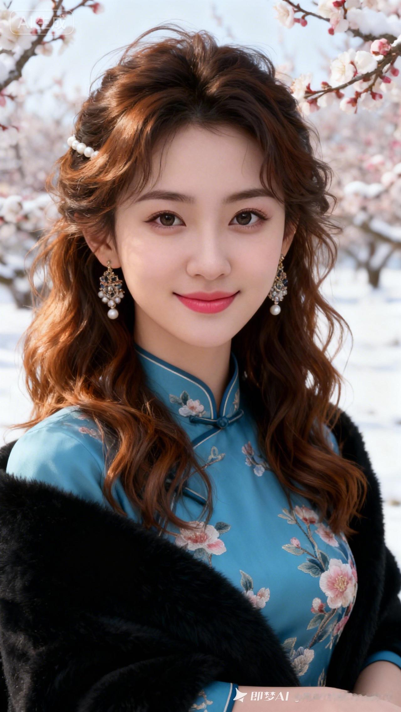 冬日雪景中的优雅女子,红唇与黑衣相映成趣。