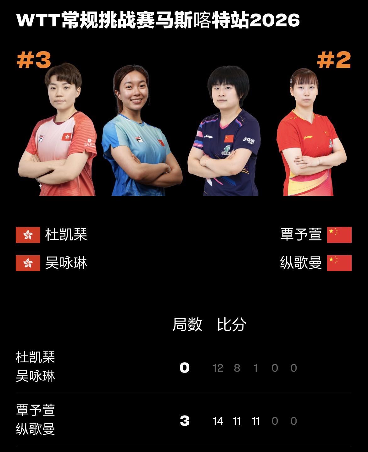 WTT常规挑战赛马斯喀特站丨女双决赛 覃予萱/纵歌曼🇨🇳3-0杜凯琹/吴咏琳🇭🇰【14-12,11-8,11-1】 覃予萱/纵歌曼🇨🇳获得WTT常规挑战赛马斯喀特站女双冠军🥇🎉