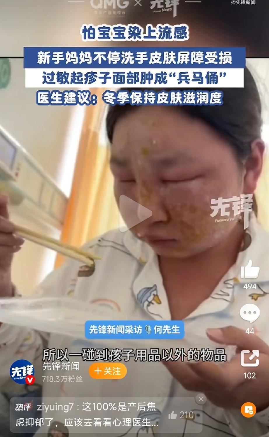 江苏一位新手妈妈因为频繁洗手,导致全身过敏住院。 可是她丈夫的表现就有点过分了。 新手妈妈对孩子过于保护,可以理解,这位妈妈怕孩子感染流感,只要接触其他东西就消毒,有些过度,但出发点都是为了孩子。 现在因为全身过敏性皮炎住院,脸也肿成了猪头,心情本来就不好,丈夫怎么对着镜头笑得这么开心呢? 要我说,新手妈妈有些焦虑时,爸爸的表现最重要,要出动站出来分担妈妈的压力, 不能在一边看笑话!