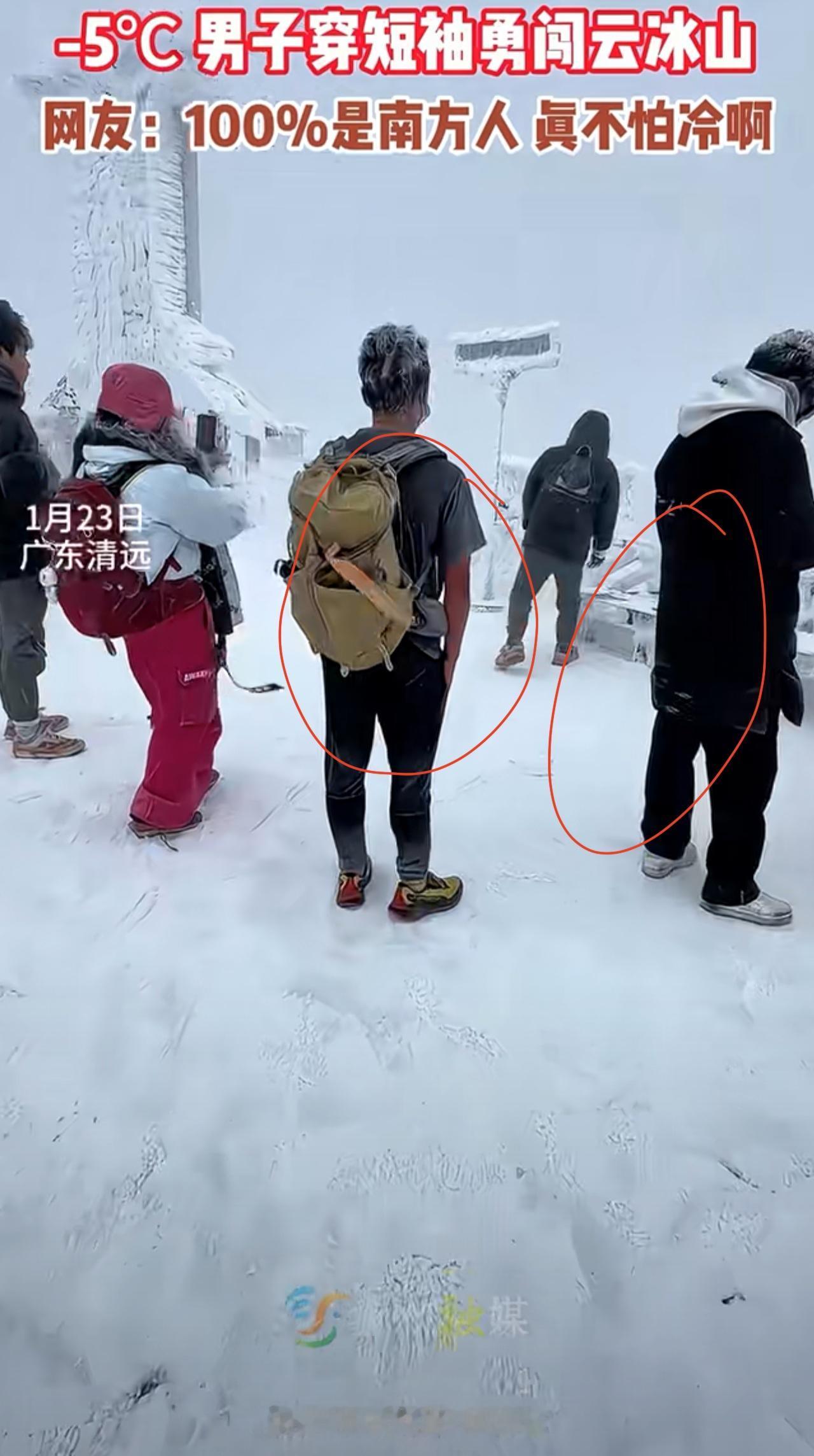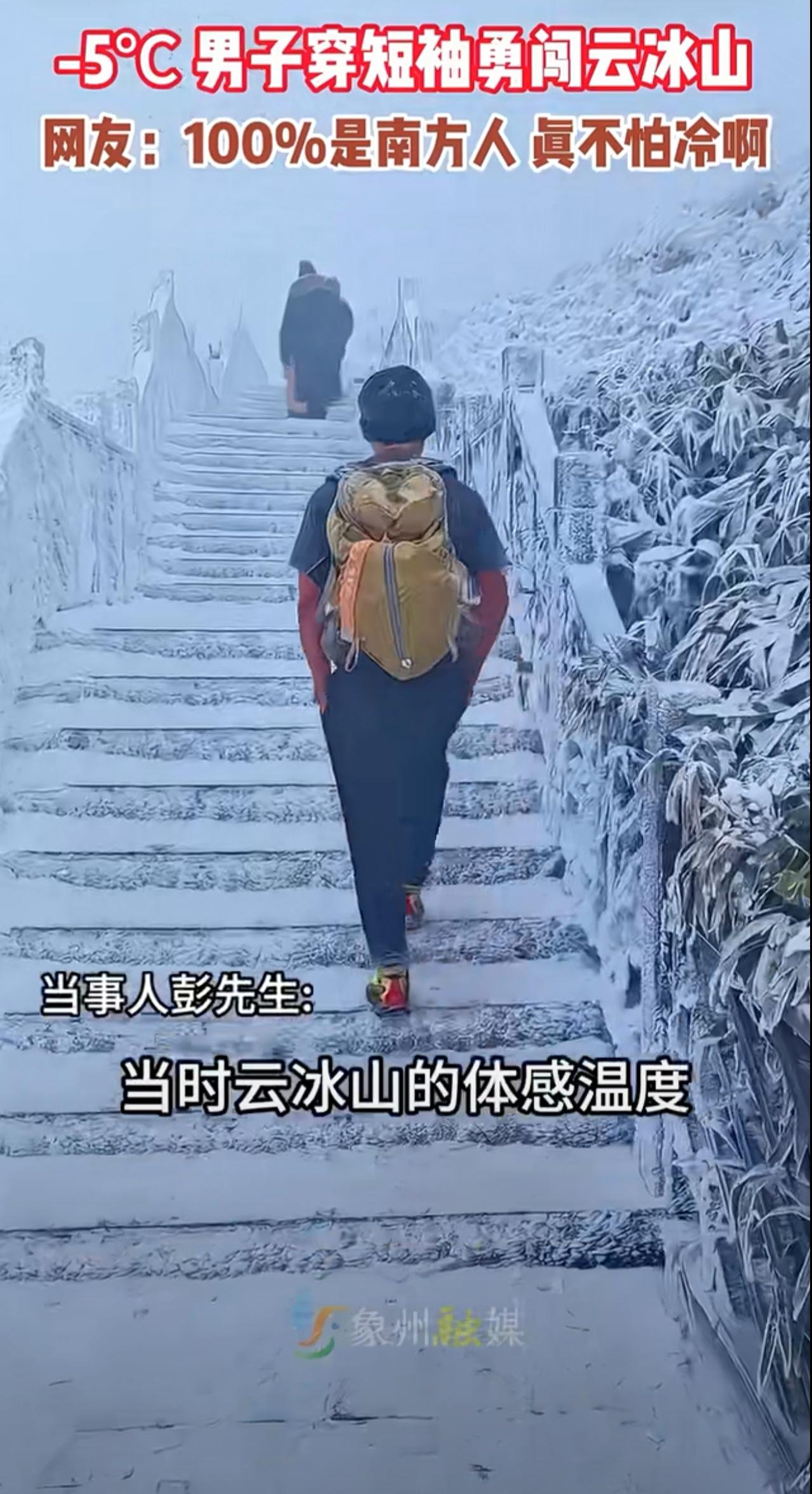 别人都是大棉袄二棉裤,他确穿个短袖! -5℃的云冰山,体感直逼长白山! 这位短袖大哥直接拿捏 网友:就问你服不服? 广东男子表示:“常年这样穿着,习惯了短袖,天天保持运动就好,当时云冰山体感温度接近长白山,虽然是零下5度,但是是零下20℃的体感。” 但是怎么看他皮肤都红了, 证明熟了 。 就像螃蟹和虾被开水烫过会变红。