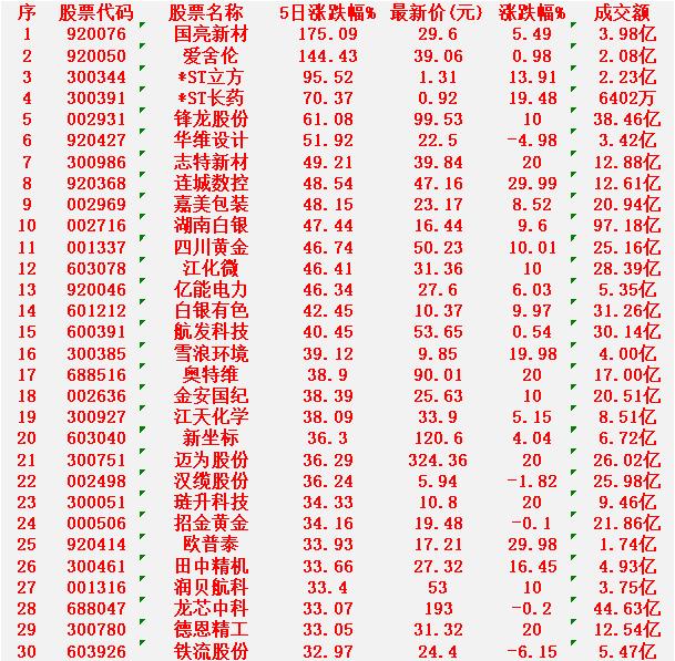 本周,整个市场“涨幅最多”的30名单汇总一览 国亮新材:涨幅 +175.09%,最新价 29.60元 爱舍伦:涨幅 +144.43%,最新价 39.06元 ST立方:涨幅 +95.52%,最新价 1.31元 ST长药:涨幅 +70.37%,最新价 0.92元 锋龙股份:涨幅 +61.08%,最新价 99.53元 华维设计:涨幅 +51.92%,最新价 22.50元 志特新材:涨幅 +49.21%,最新价 39.84元 连城数控:涨幅 +48.54%,最新价 47.16元 嘉美包装:涨幅 +48.15%,最新价 23.17元 湖南白银:涨幅 +47.44%,最新价 16.44元
