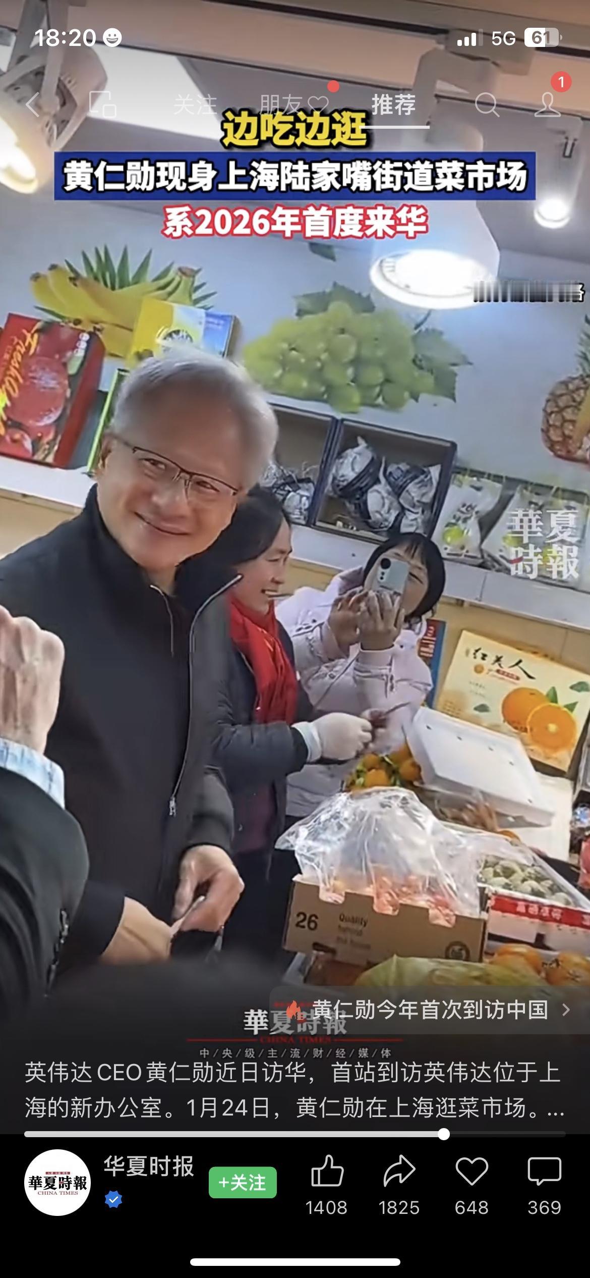 黄仁勋现身上海菜市场,边走边吃太接地气! 1月24日下午,这位AI大佬突然出现在陆家嘴乳山路锦德菜场,一身黑夹克逛遍果蔬摊,耙耙柑、草莓轮番试吃,嘴巴就没停过,还特意给水果摊主送了签名红包,买了满满一堆水果才走!上海天儿挺冷,他穿得单薄却全程笑哈哈,合影来者不拒,这反差萌直接刷爆全网!你觉得老黄这波是真心逛吃,还是藏着市场大心思? 黄仁勋 英伟达 科技大佬