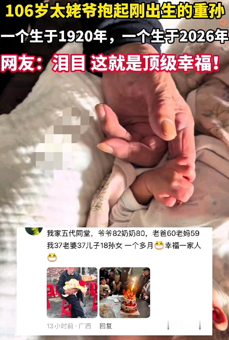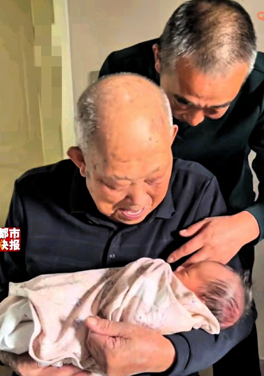 江苏106岁太姥爷拄拐见刚出生重孙,眼神瞬间发亮的模样,看一次破防一次! 这哪里是简单的相见,分明是跨越百年的血脉奔赴,是最动人的生命传承啊。 小宝宝刚出院到家,家人立马通知了挂念许久的太姥爷,老人拄拐匆匆赶来,进门就直奔小重孙,旁人都成了背景板,浑浊双眼一下就亮了,满是藏不住的欢喜。 他颤巍巍伸手牵住宝宝细嫩的小手,动作轻得像对待稀世珍宝,宝宝攥住他手指的瞬间,两代人的温度交融,像一场无声的世纪交接,温柔又有力量。 被小心抱过宝宝时,老人抱得稳稳的,低头凝视的眼神满是宠溺,褪去了百年沧桑,只剩纯粹的疼爱,这一幕真的戳中了所有人的软肋。 世人总在追名逐利,可看这一老一小同框才懂,家有一老如藏珍宝,家有一小满是期盼,这份血脉相连的亲情,才是人生最顶级的财富,千金都不换。 生命的意义从不是独自前行,而是血脉延续、爱意相传,老一辈带着岁月的沉淀守护,小一辈带着新生的希望奔赴,这份温情,才是生活最治愈的光。 这样跨越百年的相见太戳心了,你见过最动人的亲情瞬间是什么样的?