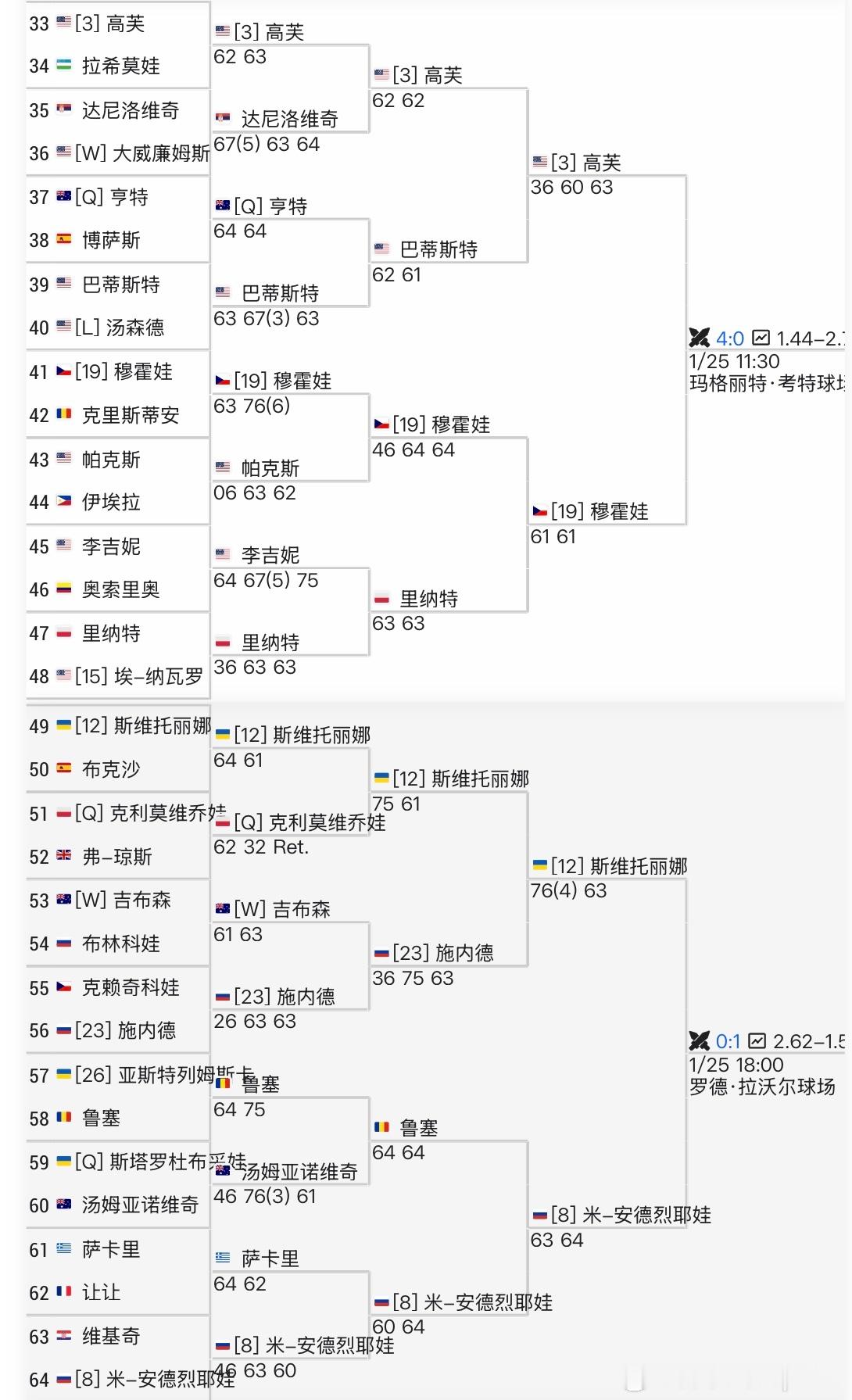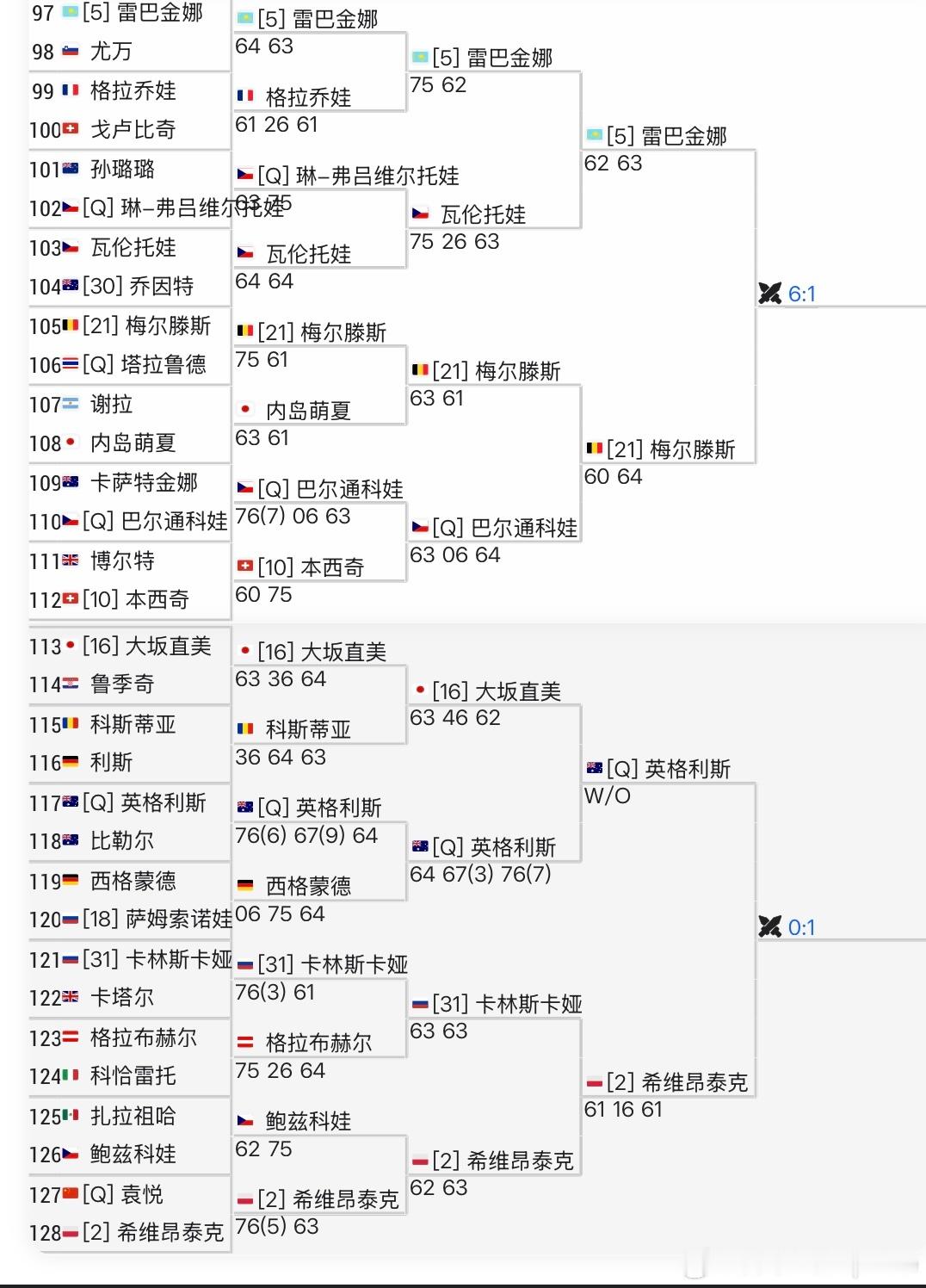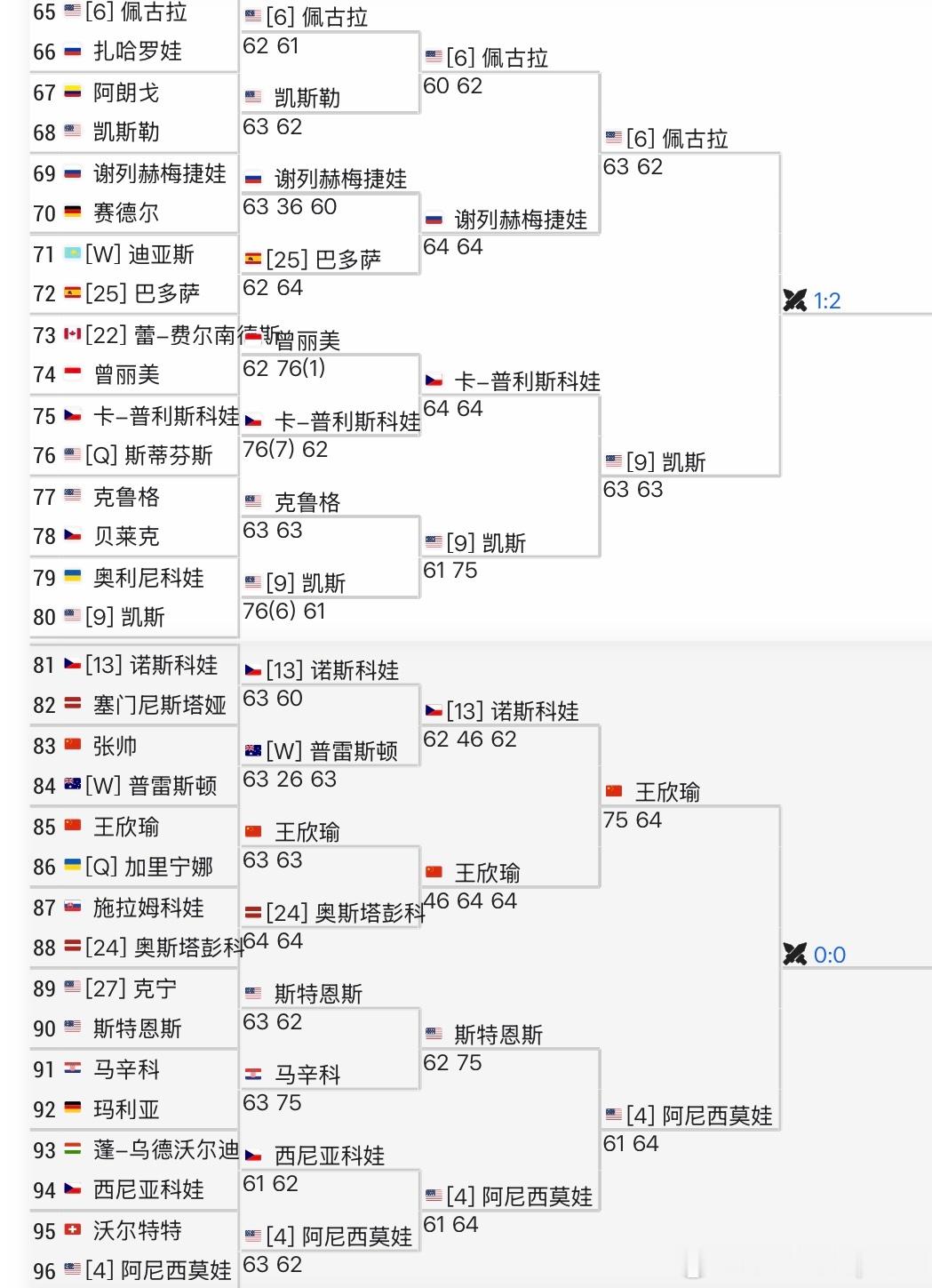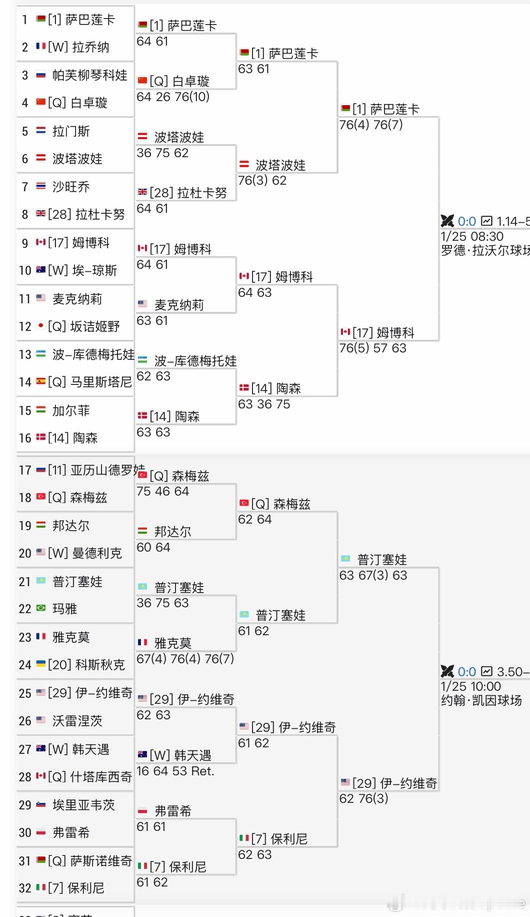 澳网女单16强对阵女单16强出炉前八种子目前只掉队1 人 ~ 大家觉得 下一轮 剩下7个大种子谁会掉队?1/4区🇧🇾萨巴伦卡vs 🇨🇦姆博科[17]🇰🇿普汀塞娃 vs🇺🇸约维奇[29]2/4区🇺🇸高芙vs 🇨🇿穆霍娃[19][12]🇺🇦斯维托丽娜 vs 🇷🇺安德列娃 3/4区🇺🇸佩古拉vs 🇺🇸凯斯🇨🇳王欣瑜 vs 🇺🇸阿尼西莫娃4/4区🇰🇿莱巴金娜vs 🇧🇪梅尔腾斯[21][WC]🇦🇺英格利斯 vs 🇵🇱斯瓦泰克王欣瑜首进澳网女单16强王欣瑜追平个人大满贯最佳战绩