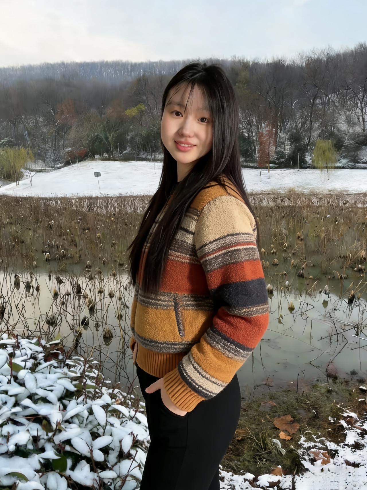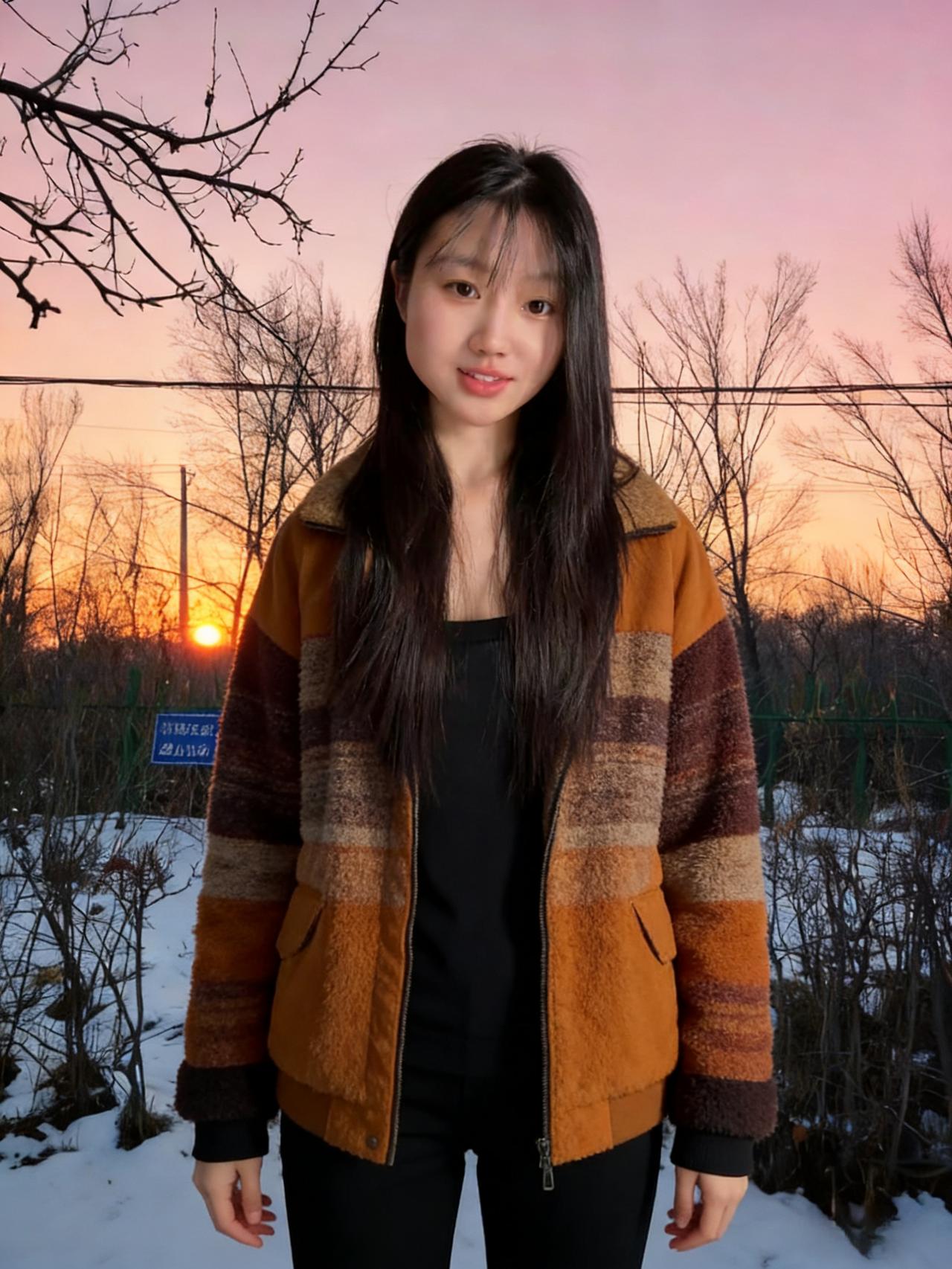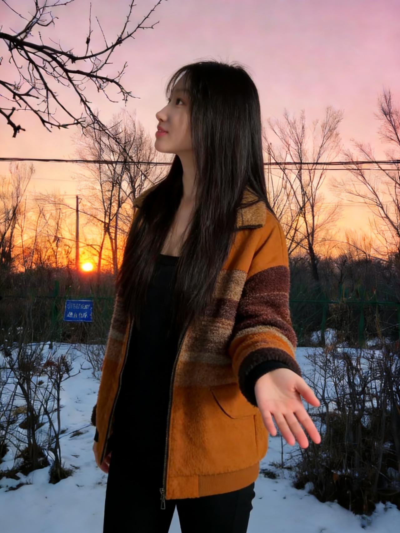 寒塘残荷覆雪轻,遥岑如墨暮云平。 焦糖裁袂融霜色,乌发垂肩映月明。 立向树前迎碎玉,行来陌上踏琼英。 人间自有春风态,不待东君已倾城。