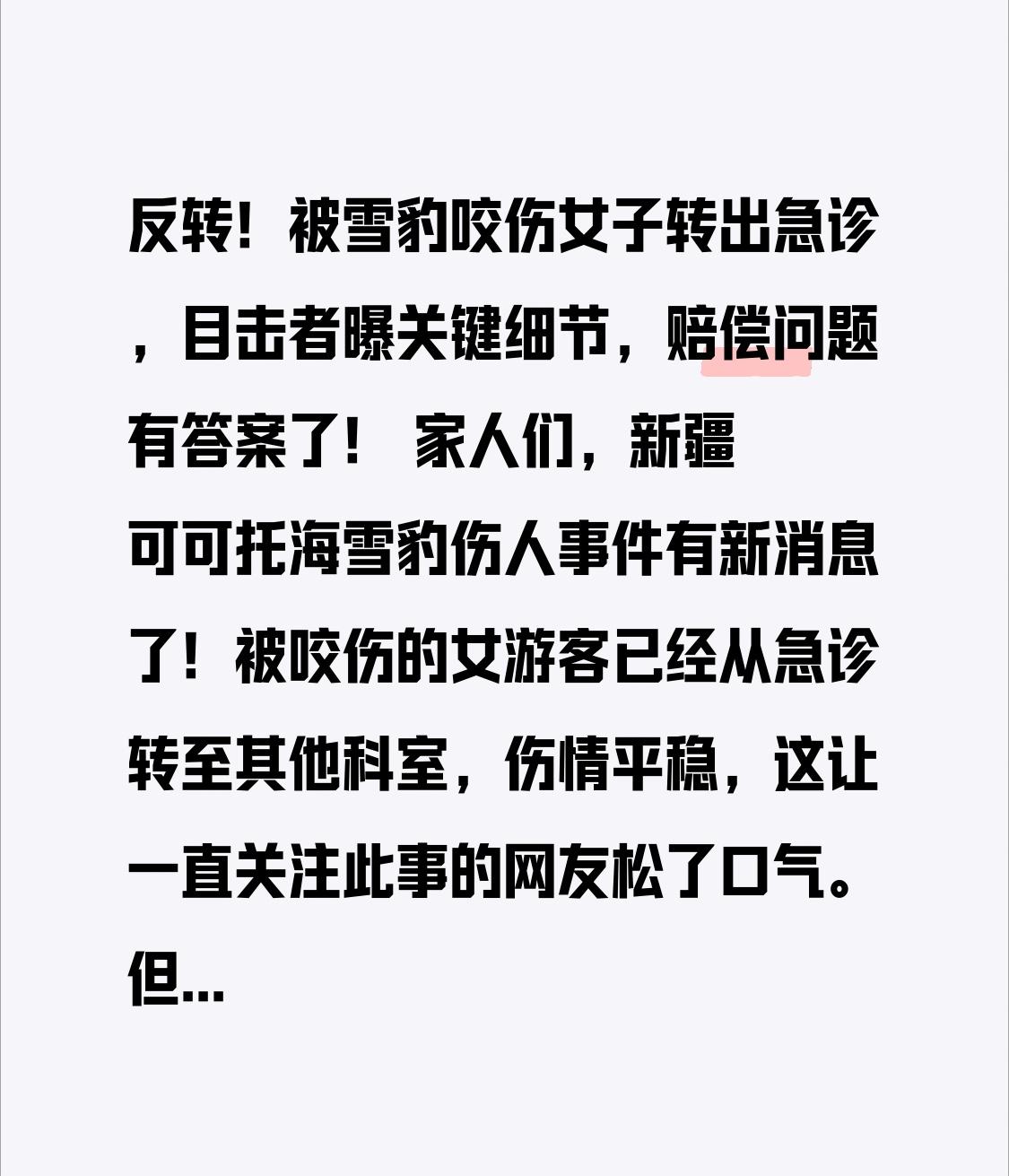 反转!被雪豹咬伤女子转出急诊,目击者曝关键细节,赔偿问题有答案了! 家人们,新疆可可托海雪豹伤人事件有新消息了!被咬伤的女游客已经从急诊转至其他科室,伤情平稳,这让一直关注此事的网友松了口气。但随着目击者陆续发声,事件真相和网传版本大相径庭,雪豹为何突然伤人?游客是否有过错?被保护动物咬伤该谁赔?这些问题终于有了清晰方向! 刚开始刷到新闻时,不少人跟风指责“游客主动摸雪豹、违规投喂才遭反击”,甚至有人说“活该”。但随着当事人同伴和救援者的爆料,转折点来了——这根本不是“自讨苦吃”,而是一场猝不及防的意外。目击者透露,事发地是前往滑雪场的必经之路,女子和同伴只是在路边10米外的雪地拍照,根本没靠近雪豹,更没伸手触摸。另一位救援者还原关键细节:雪豹先在雪地匍匐埋伏了10分钟,随后几秒内飞奔突袭,当时积雪深及大腿,游客根本来不及逃跑,万幸戴着头盔才没造成更严重伤害。 专家随后的解读更让人心惊:雪豹作为国家一级保护动物,从不会把成年人当猎物,这次攻击大概率是处于“应激状态”,加上近期雪大缺食才下山觅食,游客意外闯入了它的警戒范围。而当地村支书也证实,事发前已经多次通过公众号发布雪豹出没警示,景区尽到了提醒义务,这也让事件的责任认定有了重要依据。 最受关注的赔偿问题,法律早就有明确规定!根据《野生动物保护法》,被国家保护动物咬伤,由当地人民政府给予补偿,但如果游客存在主动挑逗、无视警示等过错,可能会减免补偿甚至拒赔。结合目前的爆料,女子并未违规,大概率能全额获得政府补偿,景区在已履行警示义务的前提下,无需担责。这里也给大家提个醒:遇到野生动物,第一原则是保持安全距离,切勿追逐拍照,真遇到危险,优先自保,紧急避险时打伤动物无需担责。 这起事件其实给所有人敲响了警钟:随着生态环境变好,野生动物下山觅食的情况越来越多,人与自然的相遇既要心存敬畏,也要懂得自保。我们保护野生动物,是为了维护生态平衡,但这不代表要牺牲自身安全。游客遵守安全提示,政府完善防护措施,才能避免类似意外重演。 如今女子伤情平稳,算是不幸中的万幸。希望她能早日康复,也希望大家记住:野外相遇不是浪漫邂逅,保持距离才是对彼此最好的保护。你怎么看待这起雪豹伤人事件?如果遇到野生动物会怎么应对?欢迎在评论区聊聊,也别忘了转发给身边爱旅游的朋友,普及安全知识!