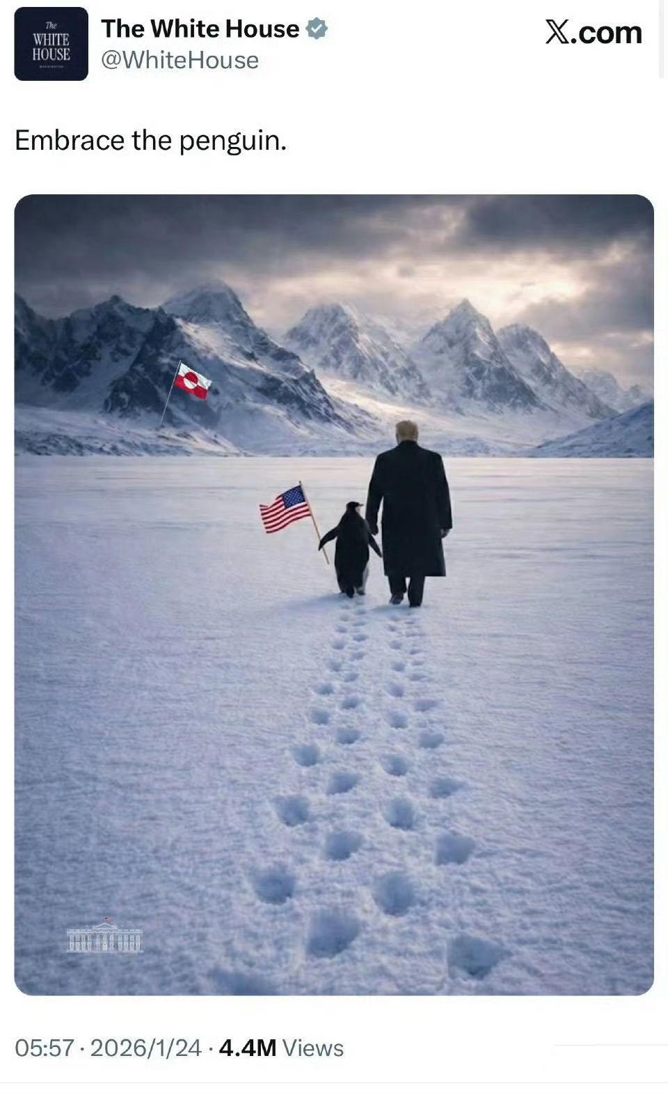白宫发了一张特朗普手牵企鹅向走格陵兰岛图片,但问题是格陵兰岛、北极都不存在企鹅,只有南极才有。看来美国文肓率高达21%不是瞎说的,连堂堂总统都搞不清楚状况,而且白宫也不审核就发出来,只能让外界看笑话——难道美国下个目标是占领南极?