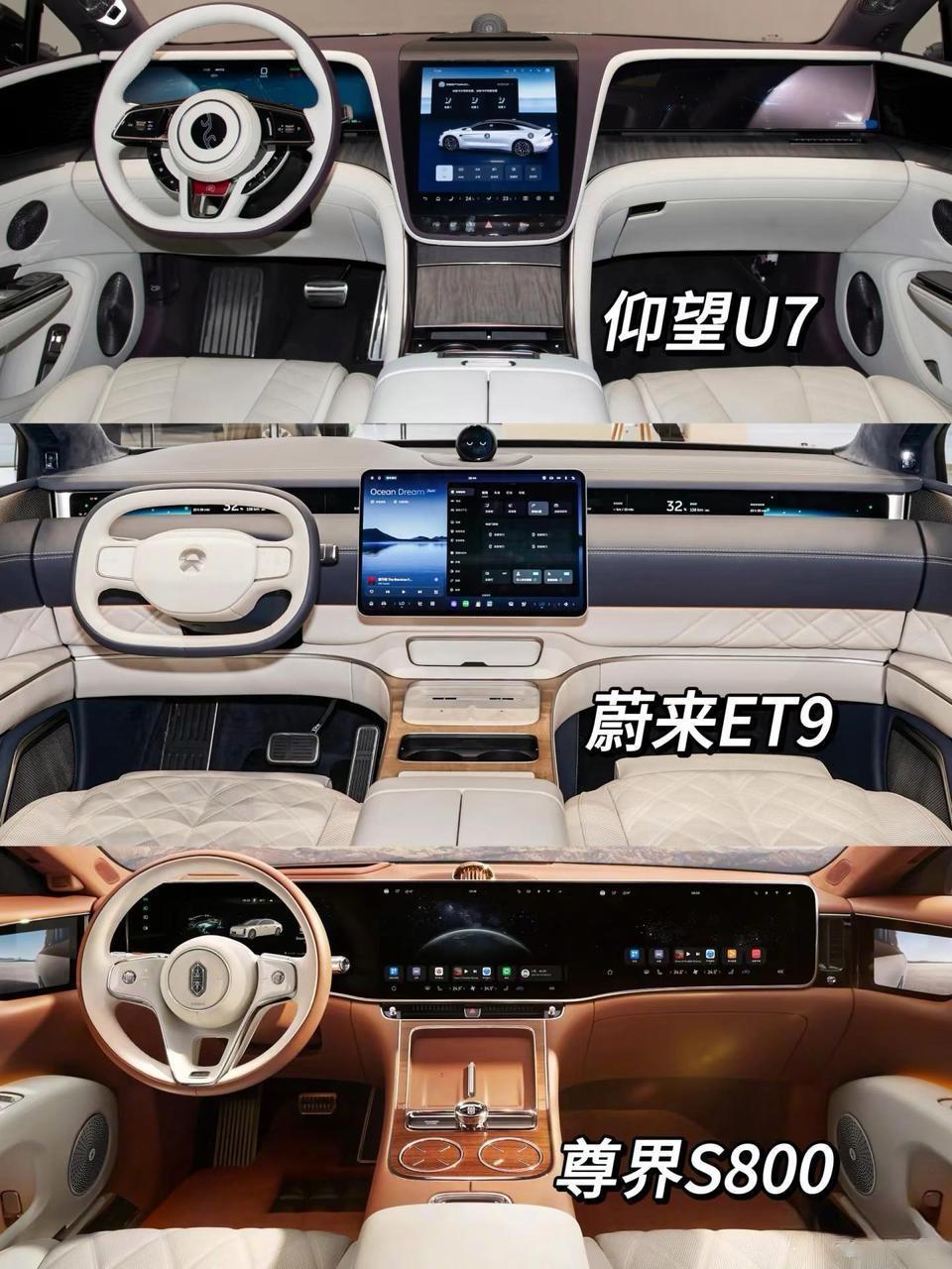 三款大型轿车内饰对比,你更喜欢哪款设计?这三款车型分别是仰望U7、蔚来ET9、尊界S800,都有自己的特色,但又都有自己的不足。 仰望U7的设计很大胆、很前卫,是三款中最有设计痕迹的,不足之处就是定位不清晰,明明定位是一款行政车。 蔚来ET9设计很简洁、很有科技感,中控屏我个人认为是里面最好看的,不足之处就是方向盘是方形的,换成圆形的那就完美了。 尊界S800设计很复古、很豪华,一看就是那种豪车的设计,不足之处就是中控屏是大连屏,真的不太喜欢这种设计。