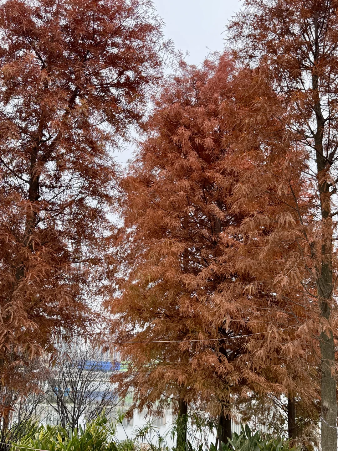 是谁羡慕了我不说!建发观湖的住户也太幸福了吧,一打开窗就是满树赤红的落羽杉,整个冬天都被这片暖色调温柔包裹住了❄️