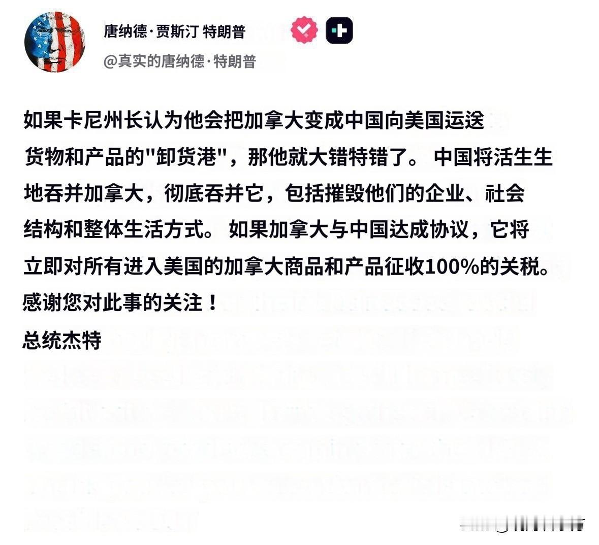 快讯:疯狂的特朗普对加拿大发出警告:如果“州长”卡尼与中国达成协议,所有加拿大商品将加征100%关税。