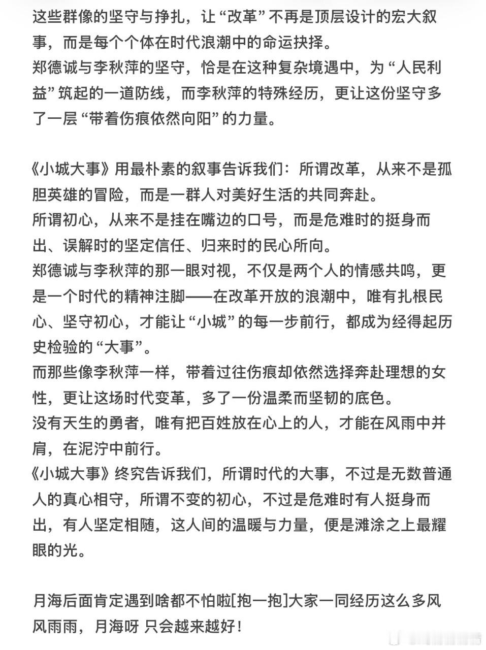 小城大事 的角色刻画真的很好,每个人物都有自己的不完美,但又都有独特的魅力;他们不说困苦,面对问题会挫败但全都保持着积极的心态,小城大事的群像奋斗看的人充满希望和热血!没看的速冲!