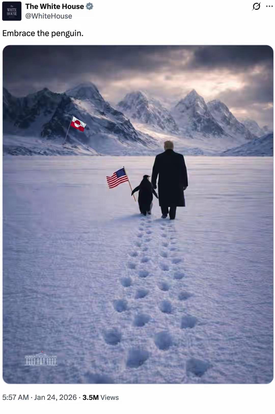 溜须溜成乌龙,白宫AI图闹大笑话!特朗普格陵兰牵企鹅,北极根本没这物种。 CNN 1月23日报道,白宫官方账号发布的画面里,特朗普牵着一只爪子举着美国国旗的企鹅,漫步在格陵兰的雪地之上,配文写“拥抱企鹅”。这是白宫溜须特朗普而发布的图片。 白宫的工作人员都没学过地理吗?这张图刚一发布就笑翻了全世界,太乌龙了!企鹅是南半球特有的物种,主要分布在南极及周边海域,北极地区根本没有野生企鹅生存。 敢问一句:美国下一步是不是要去南极洲“认领”领土了?