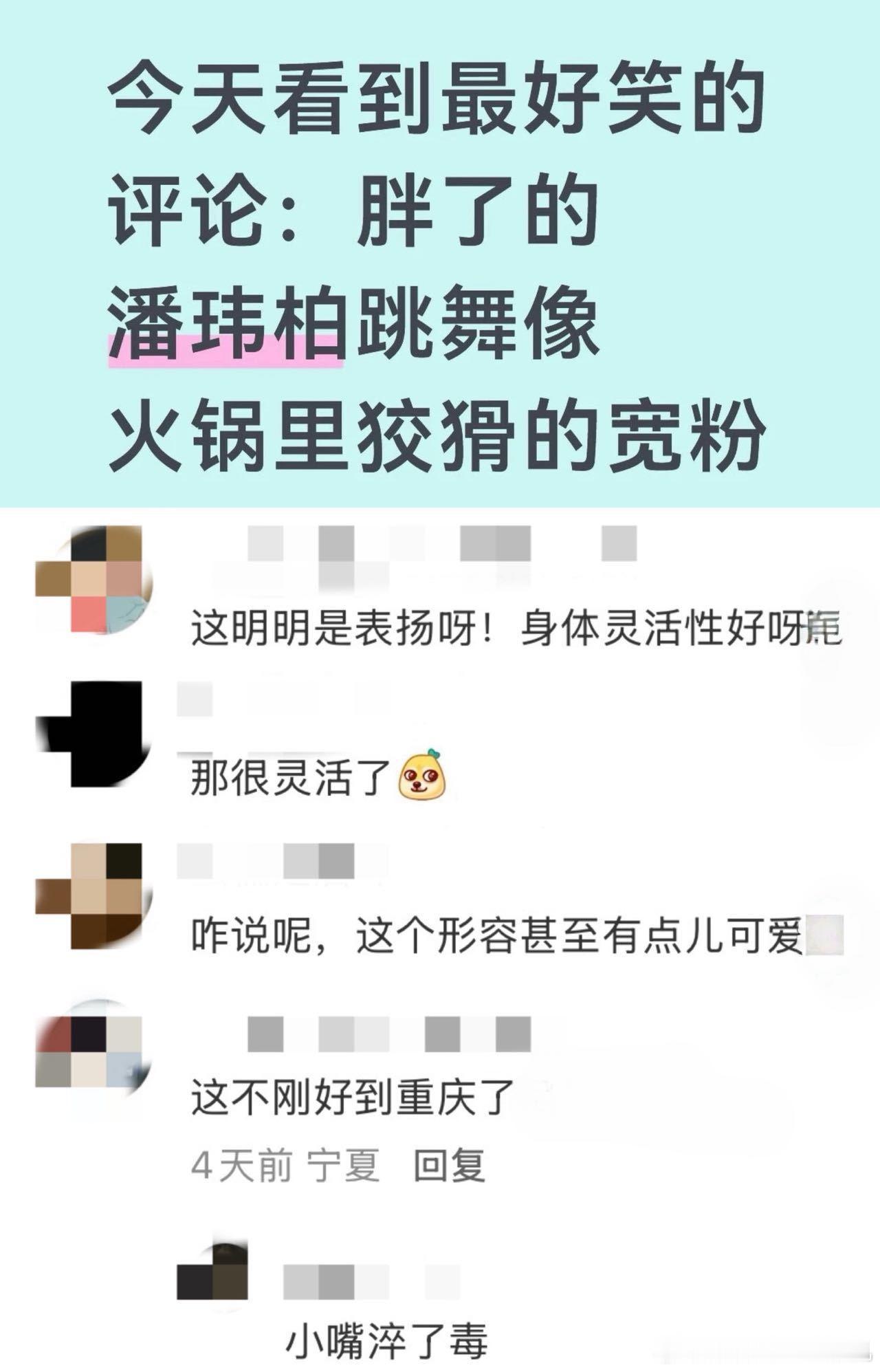 潘玮柏火锅里狡猾的宽粉 潘玮柏在重庆演唱会上的接梗能力太强了。粉丝之前调侃他跳舞像火锅里滑溜溜的宽粉,他直接现场改编歌词唱出来,这反应速度又幽默又暖心。