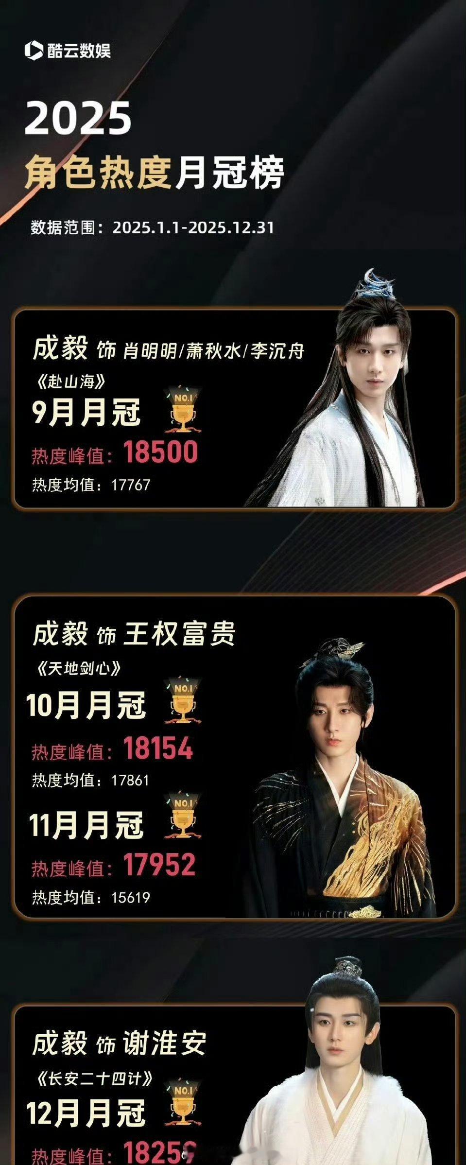 2025酷云角色热度月冠榜,成毅拿下9、10、12月月冠榜冠军🎉恭喜成毅