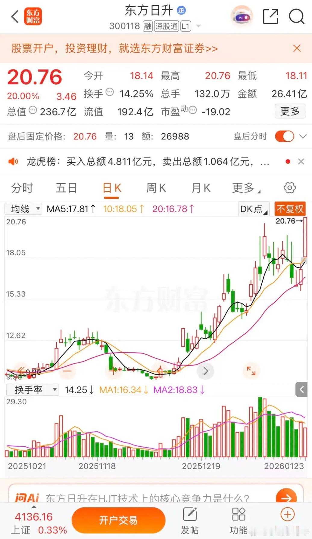 马斯克力挺太空光伏,隆基绿能,东方日升那个是龙头隆基绿能涨停板收盘报收19.35元每股,成交金额93.94亿元。挺多在一个半板。东方日升涨停板收盘报收20.76元每股,成交金额26.41亿元,还是这个好,名字好,市值也好 才236.7亿元,东方日升升升升,500亿市值有望冲击。隆基绿能绿绿绿,不好,东方日升升这次估计上到30元每股。