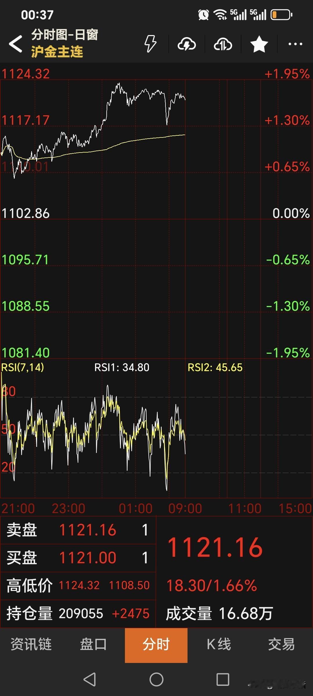 周五夜盘, 国内黄金期货 继续走强上涨。 主力合约停收于1121.16元, 较上一日上涨18.3元。 曾经认为1100金价能止住, 现在看,金价的上涨才到半山腰!