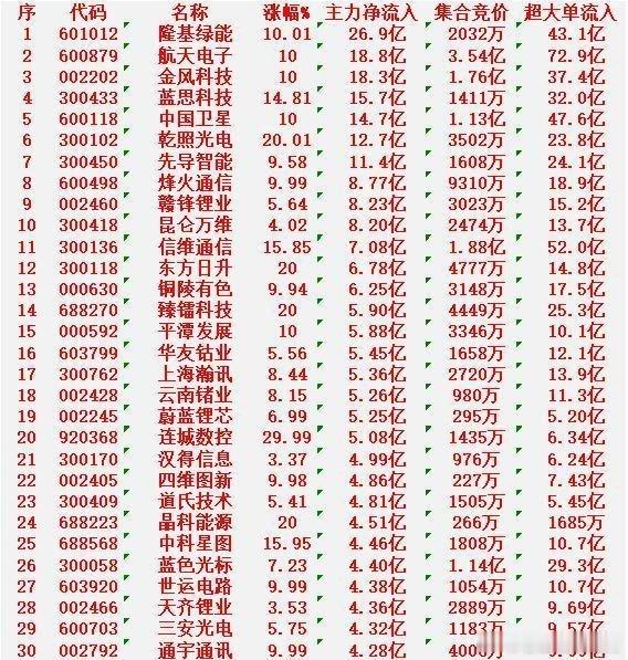 1月23日收盘,主力资金“大幅买入”的30名单:隆基绿能:净流入26.9亿元航天电子:净流入18.8亿元金风科技:净流入18.3亿元蓝思科技:净流入15.7亿元中国卫星:净流入14.7亿元乾照光电:净流入12.7亿元先导智能:净流入11.4亿元烽火通信:净流入8.77亿元赣锋锂业:净流入8.23亿元昆仑万维:净流入8.20亿元信维通信:净流入7.08亿元东方日升:净流入6.78亿元铜陵有色:净流入6.25亿元臻镭科技:净流入5.90亿元平潭发展:净流入5.88亿元华友钴业:净流入5.45亿元上海瀚讯:净流入5.36亿元云南锗业:净流入5.26亿元蔚蓝锂芯:净流入5.25亿元连城数控:净流入5.08亿元