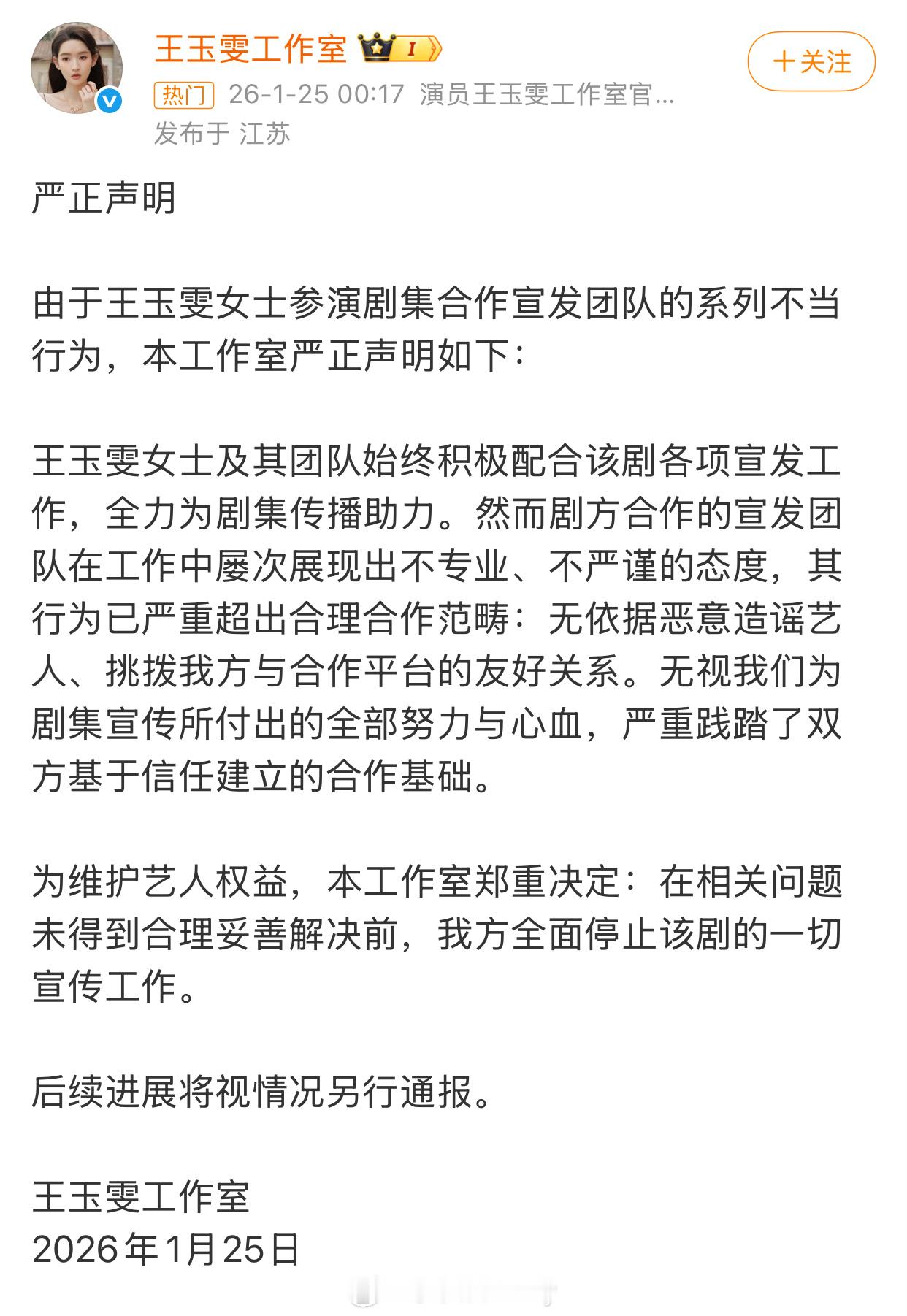 王玉雯工作室发声明了:在相关问题未得到合理妥善解决前,王玉雯方全面停止该剧的一切宣传工作