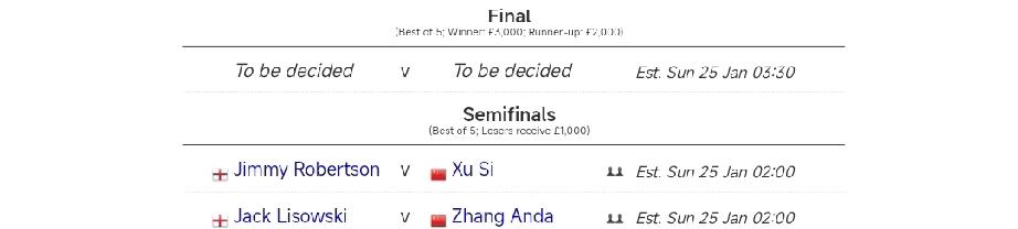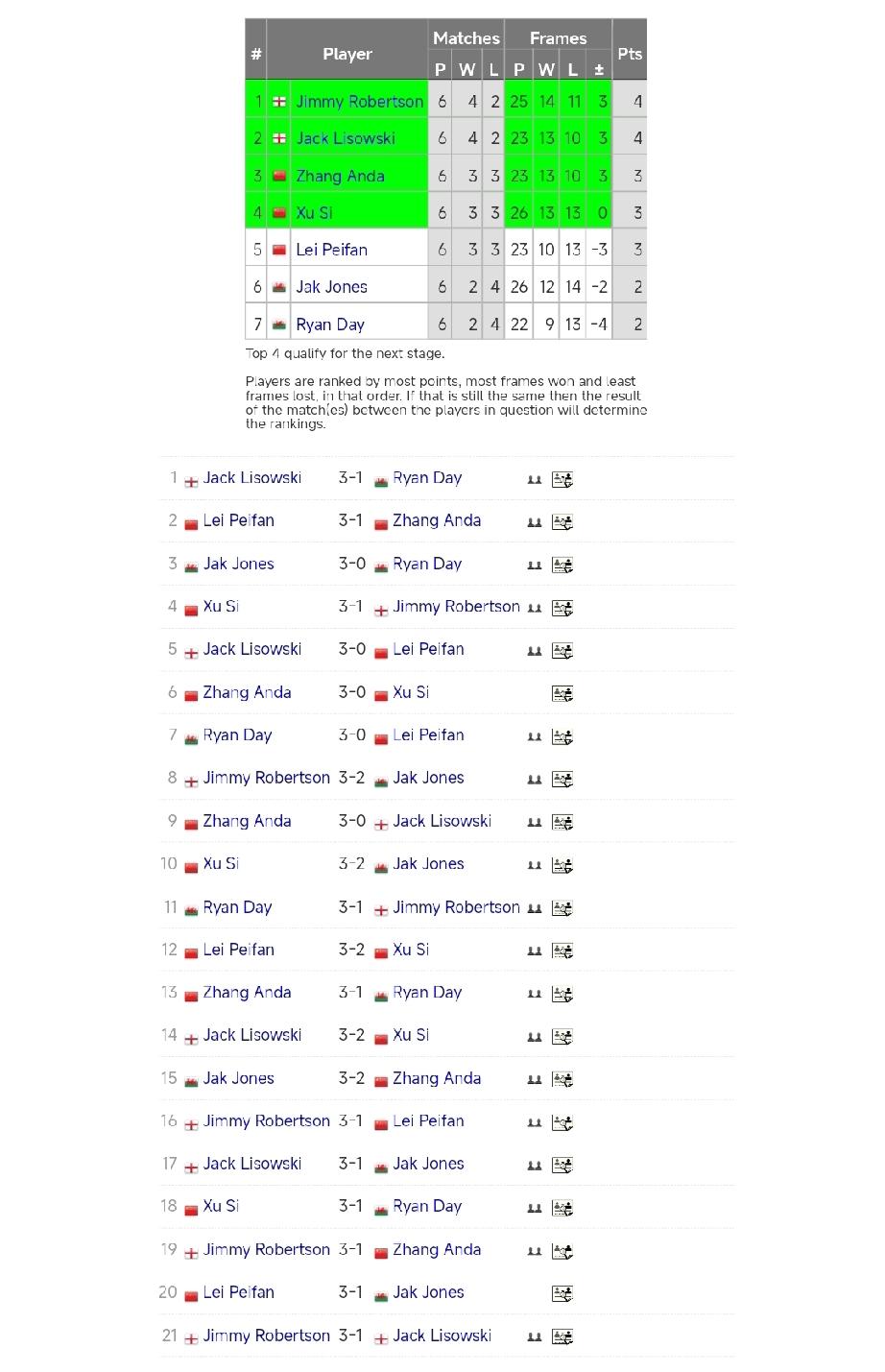 徐思、张安达晋级四强! 1月25日凌晨,斯诺克冠军联赛第七小组循环赛结束。 吉米·罗伯逊、杰克·利索夫斯基、徐思、张安达名列前四,携手晋级小组半决赛。半决赛对阵如下: 吉米·罗伯逊对阵徐思 杰克·利索夫斯基对阵张安达 半决赛的胜者争夺小组冠军,冠军晋级胜者组。