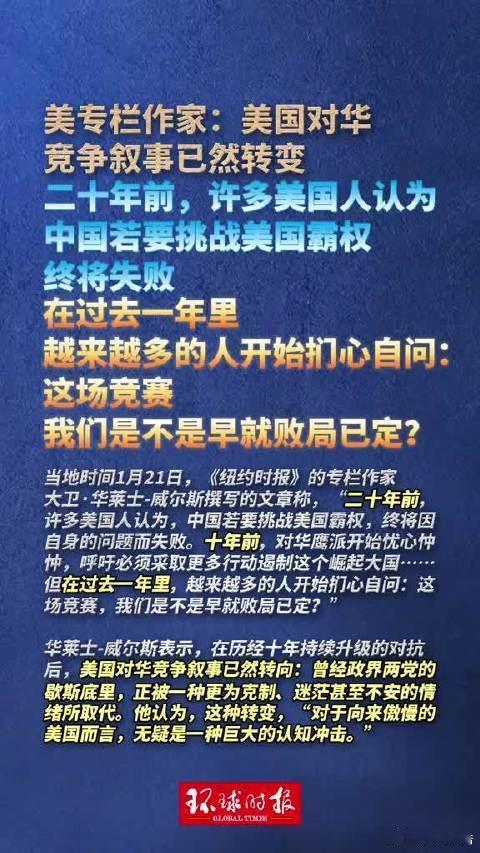 美国对华心态变了美媒发现美国对华从冷战式对抗转向纠结,鹰派共识破裂,因中国在绿科、AI、造船等多领域大幅领先,美各界开始正视差距,西方甚至主动寻求融入中国供应链,对华心态添了敬畏。