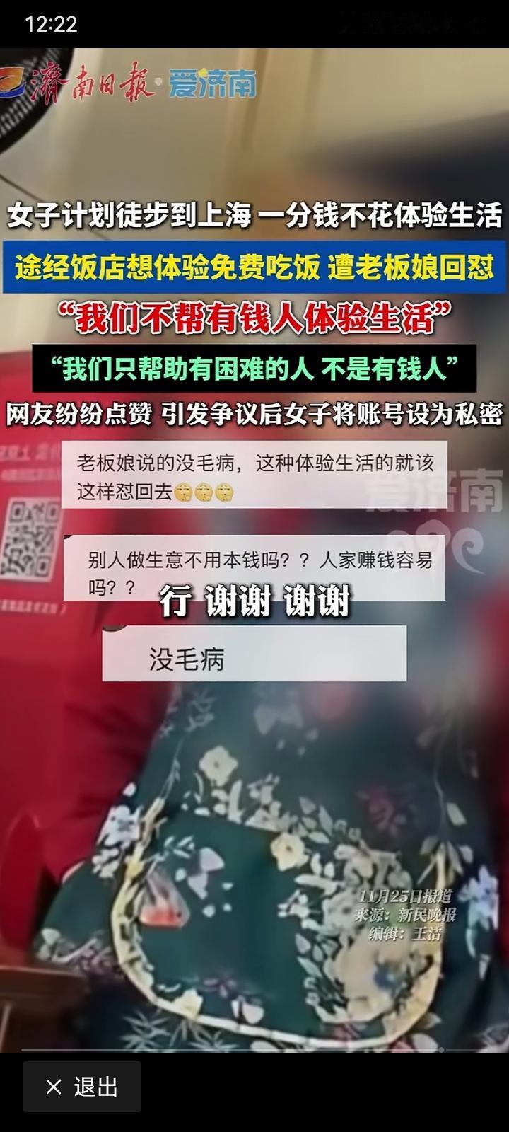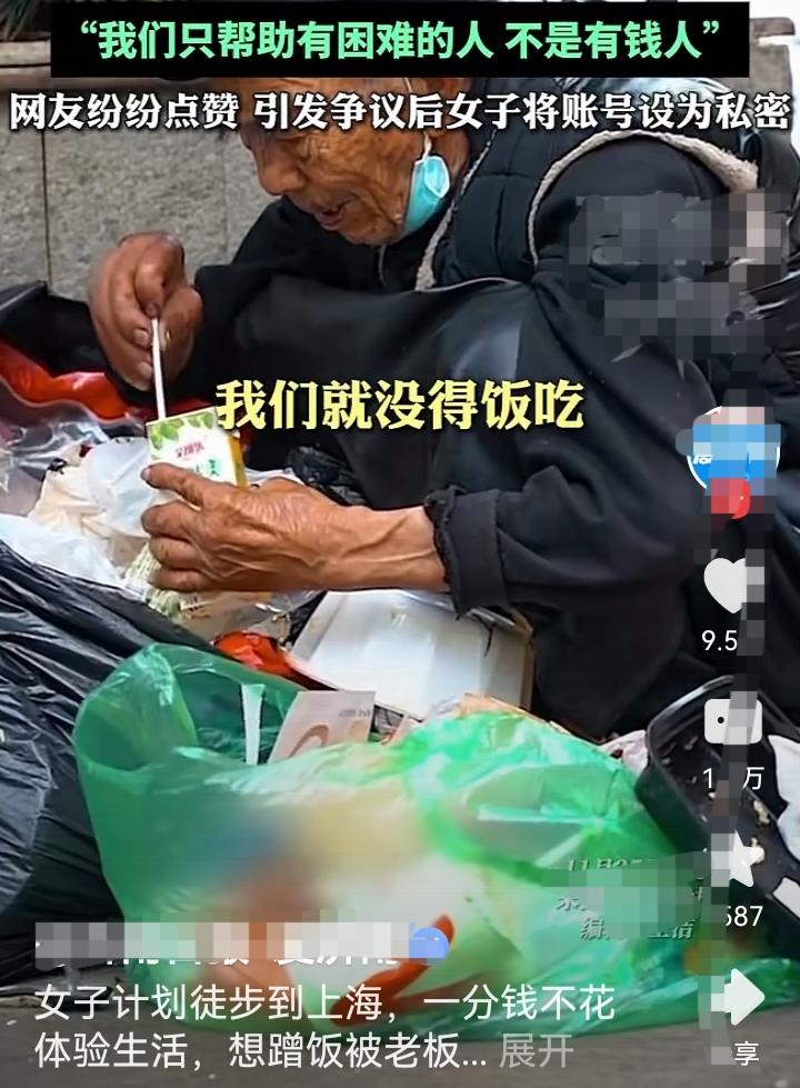 徒步蹭饭被老板娘怒怼:“我们不帮有钱人体验生活!” 评论区一边倒 老板娘的一句怒吼,撕开了“穷游体验生活”的遮羞布。 1. 一场“体验生活”的闹剧 这位女子自称从杭州徒步去上海,计划一分钱不花走完全程。她走进路边的小饭店,试图免费蹭一顿饭,理由是“这是我的体验课”。 面对她的请求,饭店老板娘没有惯着,直接回怼: “我们不帮有钱人体验生活!” “我们只帮助有困难的人,不是你们这种来体验生活的有钱人!” 女子辩解“不是舍不得钱,是规定不让花”,但老板娘根本不吃这一套:“别人做生意不用本钱吗?人家赚钱容易吗?” 这段对话被曝光后,女子的社交账号因争议太大,很快就设为了私密。 2. 评论区集体叫好:怼得好! 视频一出,网友们几乎一边倒力挺老板娘: “凭什么你的体验感,要别人买单?” “真有困难的人不会理直气壮要饭,这就是想白嫖。” “老板娘说出了所有普通人的心声,小本生意谁都不容易。” 大家反感的,从来不是“穷游”本身,而是这种把“体验生活”当借口、理直气道德绑架他人的行为。 真正的旅行,是用自己的方式感受世界,而不是把别人的善意当成理所当然。 3. 谁都没有义务为你的“情怀”买单 这件事之所以戳中大众痛点,是因为它折射出当下一种畸形的“体验式穷游”风气: 有人打着“寻找自我”的旗号,蹭吃蹭喝蹭住宿; 有人把别人的善良当成流量密码,拍视频博眼球。 但现实是,饭店老板娘起早贪黑赚的是辛苦钱,路人的善意也不是无限供应的。 你可以选择用脚步丈量世界,但不能要求陌生人用钱包为你的“情怀”买单。 就像老板娘说的:“我们的善良,只给真正有困难的人。” 社会热点 徒步挑战争议 穷游消费